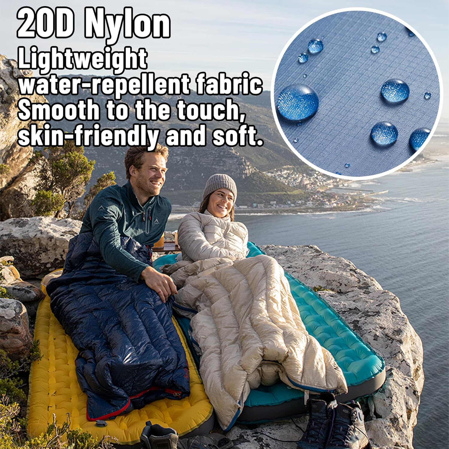 Water-repellent, lightweight and compact – A unique baffle design prevents down shift, ensuring even warmth distribution. Lightweight and compact for all seasons. Made with 20D tear-resistant nylon (smooth, durable, easy-clean). Water-repellent fabric blocks moisture. Weighs ~1.3 lbs/565g (like a water bottle). Packs to Φ 12×26cm; compressible for storage.