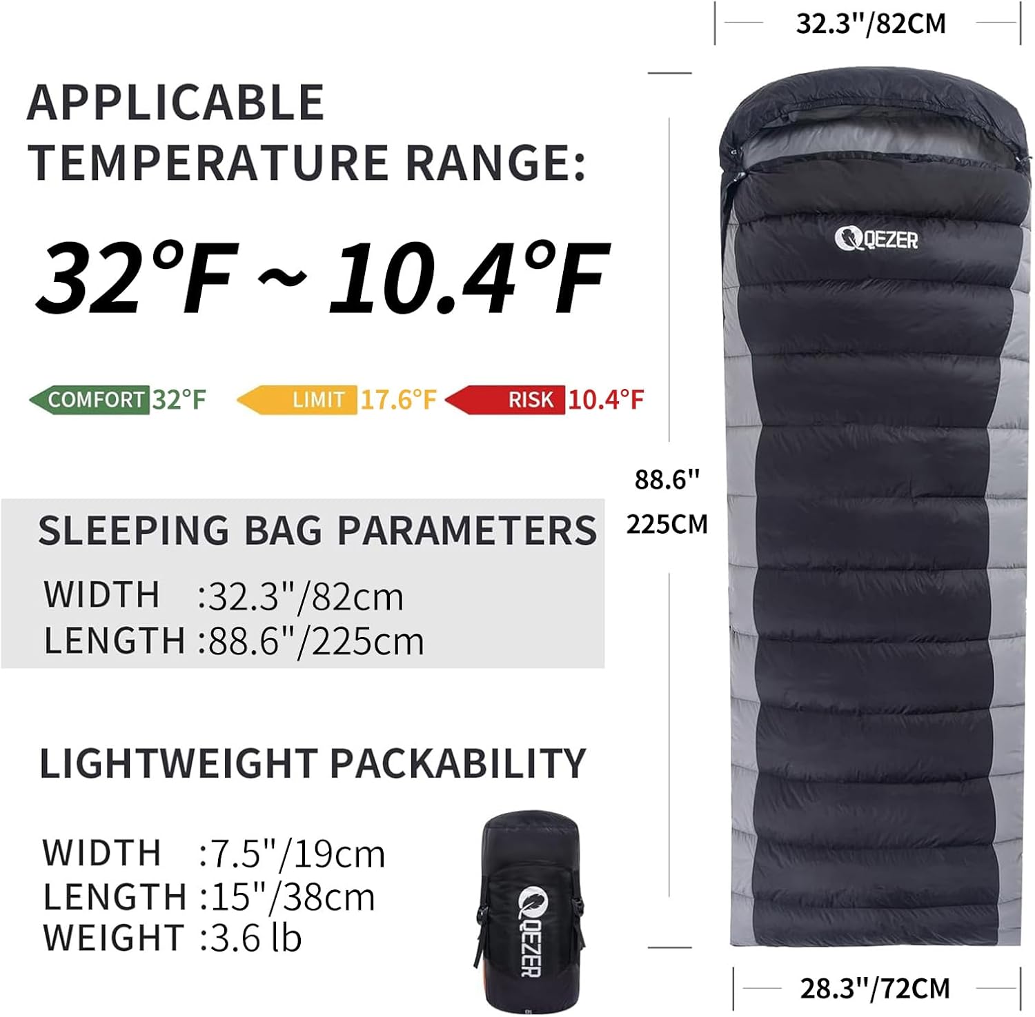 Keep Warm: Backpacking sleeping bag Filled with 600 FP premium duck down, comfort temperature 32°F-17.6°F, limit 10.4°F. Double zipper design prevents cold air, added chest insulation for better warmth