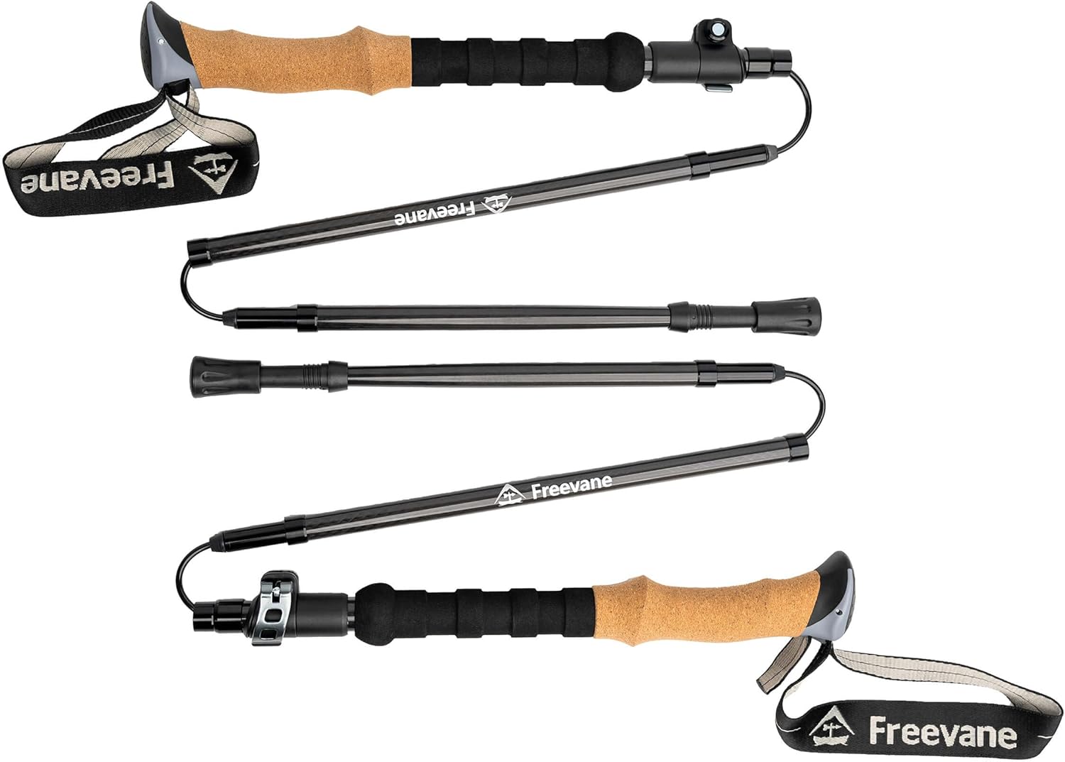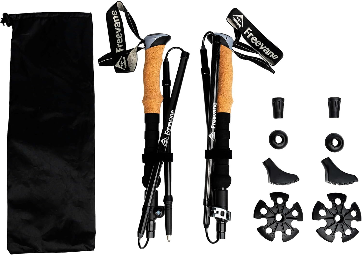 Sold as Pair Shaft material High-performance carbon fiber Sections 5 (folding) Internal cable UHMWPE Length range 45.3–53.1 in (113–135 cm) Recommended Height 65–78 in (165–198 cm) Folded length 14.6 in (37 cm) Weight 7.3 oz (207 g) per pole; 14.6 oz (414 g) per pair Grip Genuine cork with extended EVA lower grip Strap Dual-layer nylon, quick-adjust, sweat-wicking/fast-dry Locks Metal external lever locks with tension-adjust knob Tube diameters 0.71 | 0.63 | 0.55 | 0.55 | 0.55 in (18 | 16 | 14 | 14 | 14 mm) Tip Durable tungsten carbide tip Included accessories 1 pair snow baskets, 1 pair sand/mud baskets, 1 pair boot tips, 1 pair rubber tips, Carry/storage bag