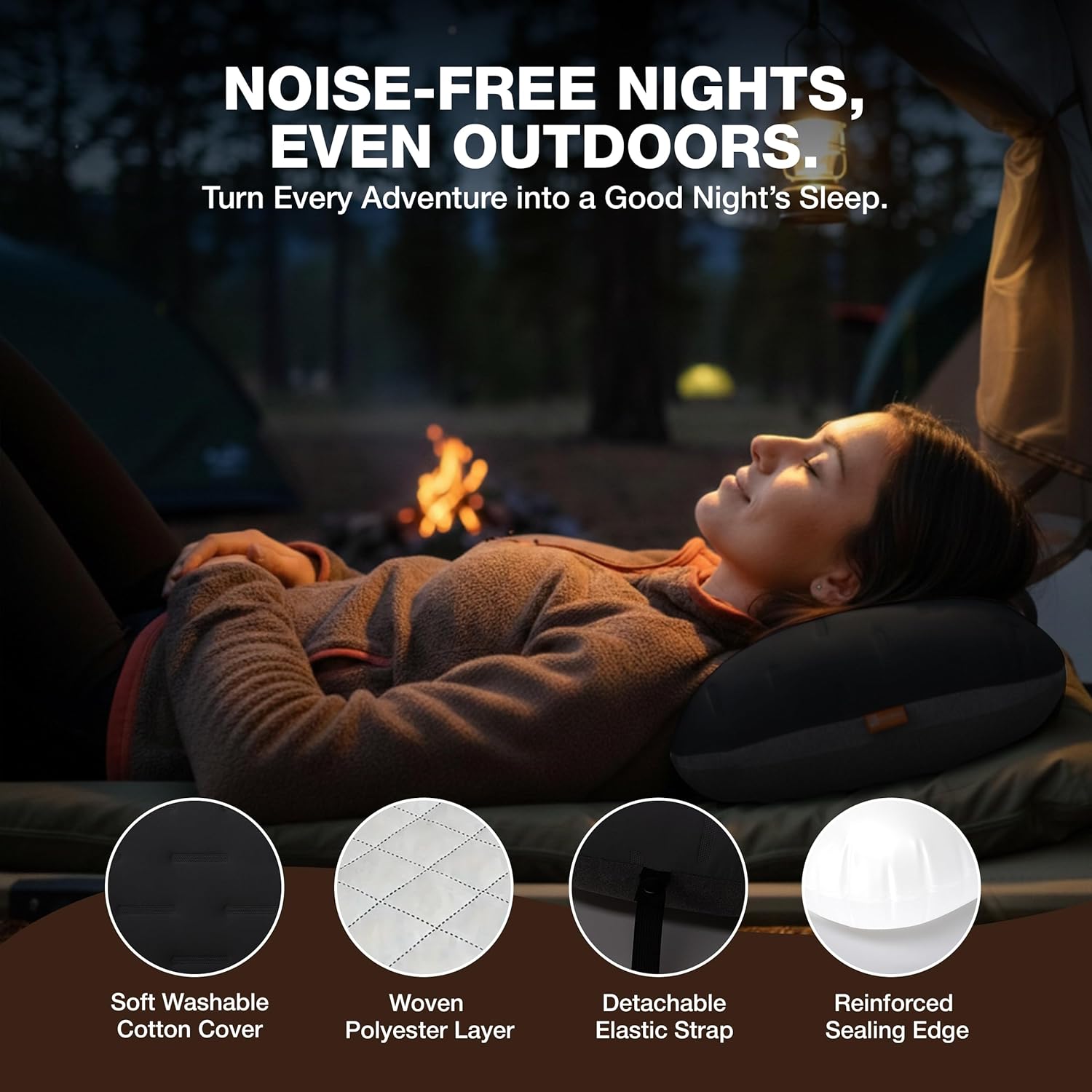 REMOVABLE, WASHABLE SOFT COVER FOR NOISE-FREE COMFORT: The breathable, skin-friendly cover adds soft cushioning and eliminates the “plastic crinkle” noise common in basic inflatable pillows. Fully removable and washable for hygiene. The inner woven layer reduces friction noise, keeping your sleep quiet whether in a tent, car, airplane, or hammock.