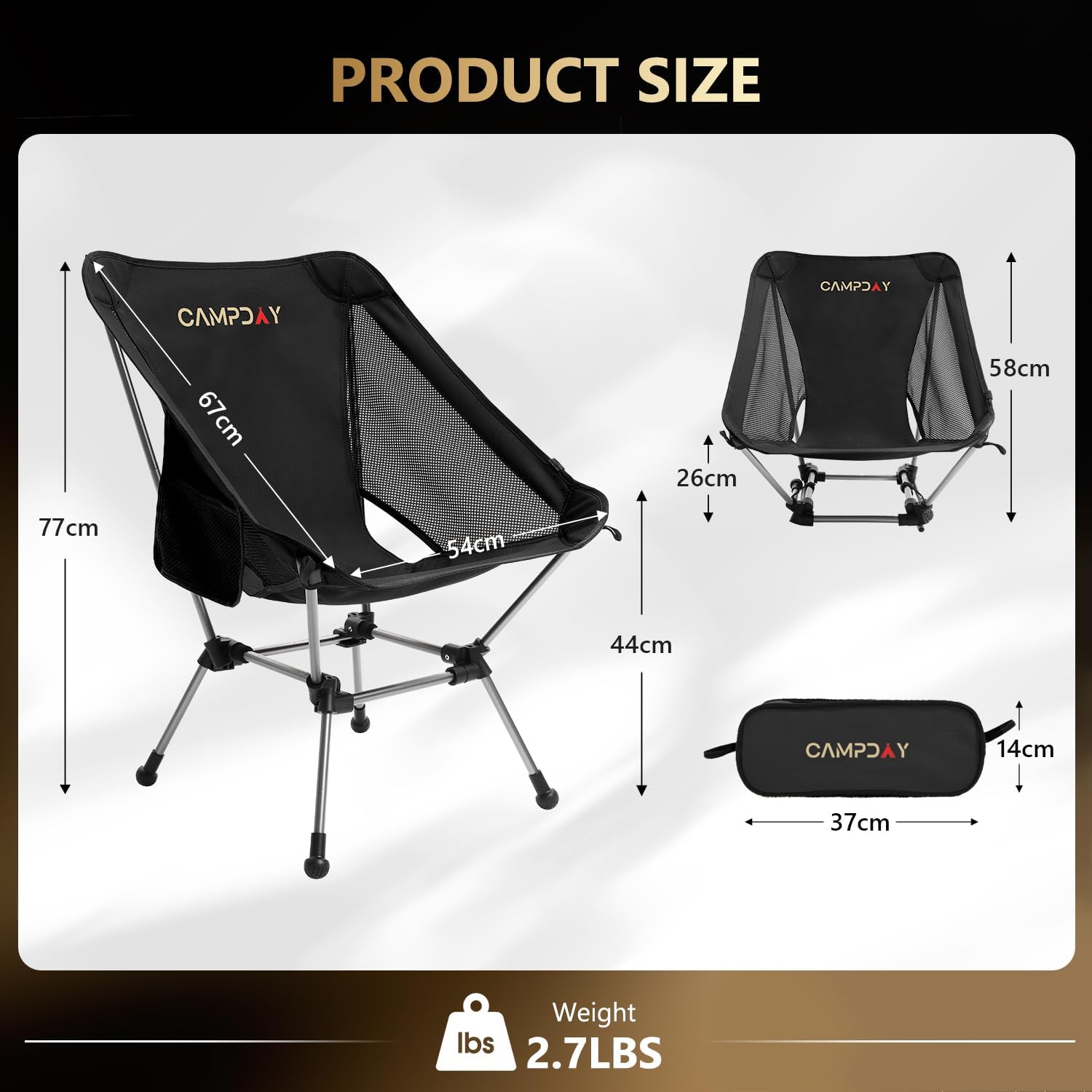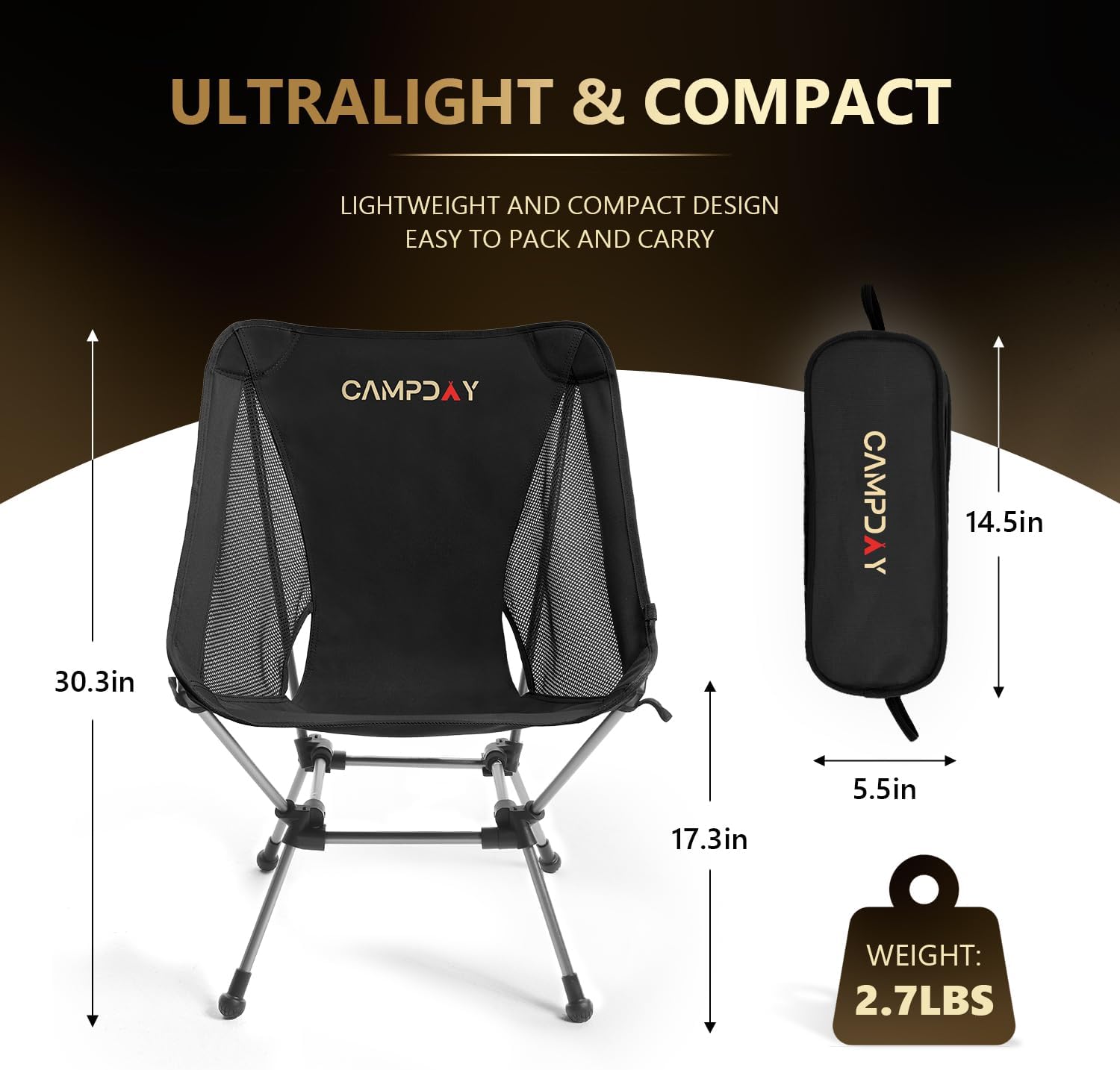 Versatile Use: The CAMPDAY camping chair is ultra-light and portable, perfect for all your outdoor adventures—camping, backpacking, beach days, hiking, fishing, BBQs, and picnics. Enjoy on-the-go comfort with its ergonomic design