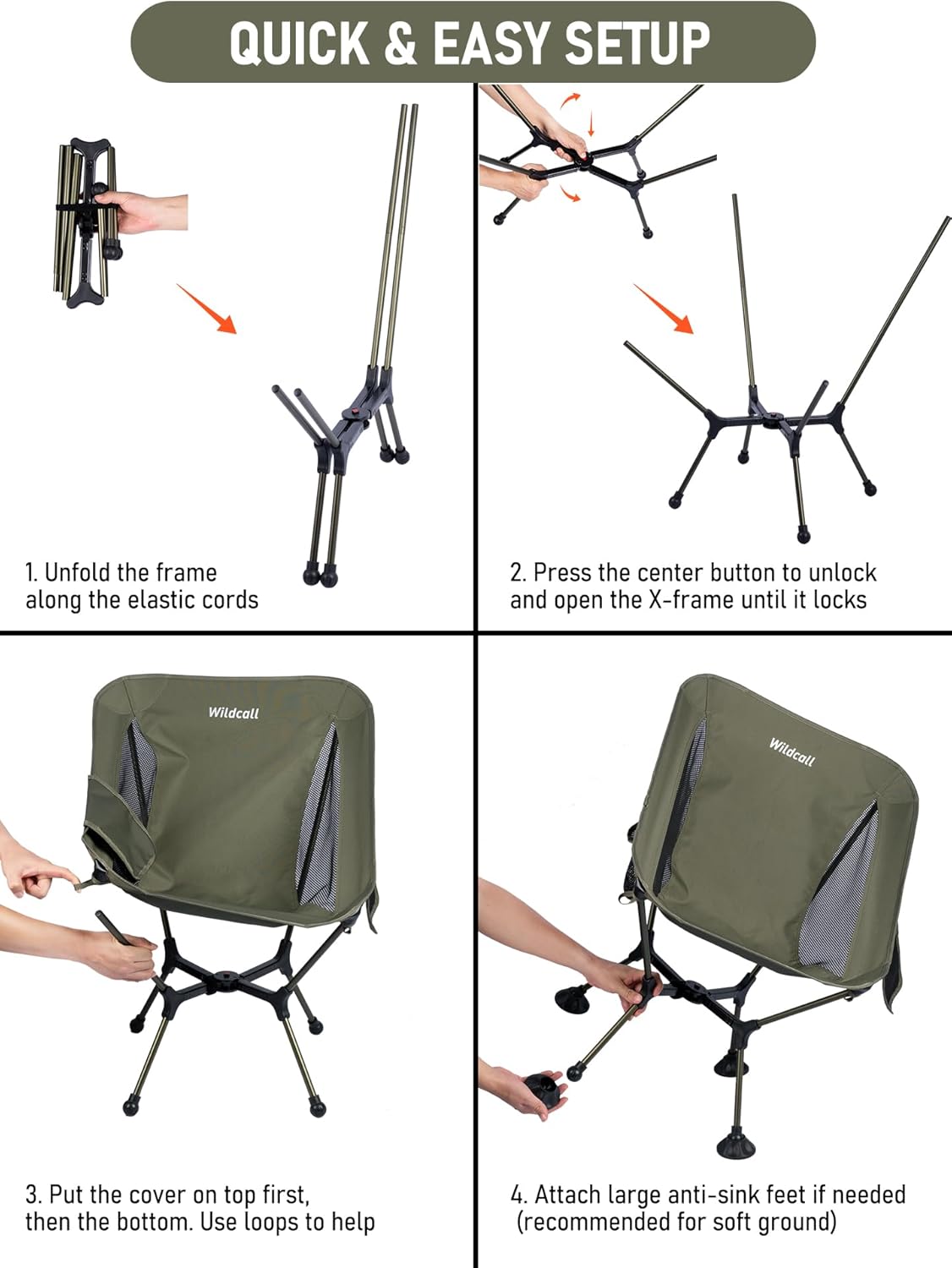 More stable & Quick setup Unique lockable X-shaped frame delivers superior stability and quick setup Large anti-sink feet Large detachable anti-sink feet, won’t sink in the sand or soft ground Ultralight but heavy duty Lightweight but heavy duty, only 2.6 lbs , supports up to 264 lbs Compact Compact, small when packed Reliable All 4 corners of the seat fabric are reinforced to ensure reliability Breathable A breathable mesh back keeps you cool and comfortable Comfortable Deep seat area will give you more comfort Easy setup Very easy and quick to set up Side pocket Cup holder to keep your drink at hand; Side pocket for small stuff Multipurpose Backpacking, Beach, Cycling, Motorcycling, Outdoor, Sport events, Tailgating, Glamping, Camping, Hiking, Concert