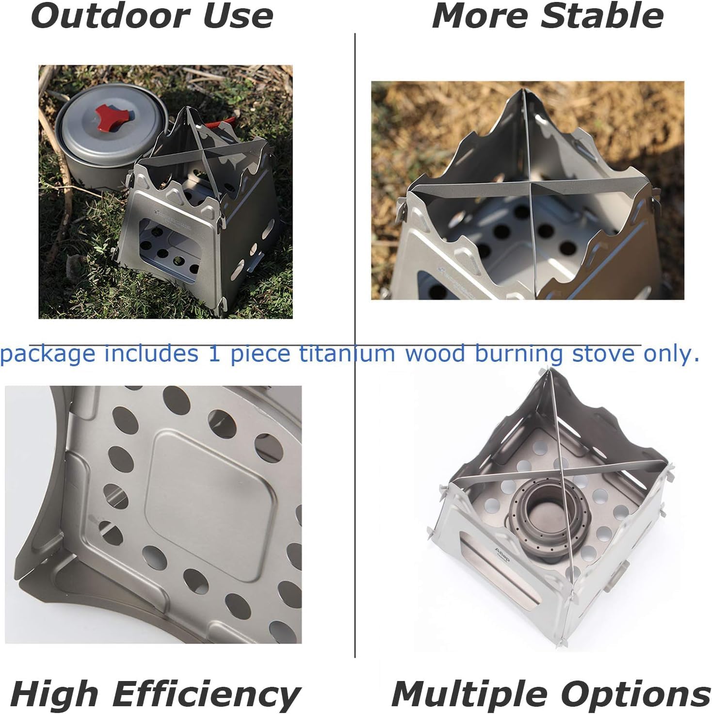 Titanium Wood Burning Stove. Made of titanium material, durable and lightweight. Wide-door design for improving air flow, which is convenient for adding fuel and improving the burning efficiency. Cross-stand trivet creates a stable cooking platform for the pot size. Suitable for 2~3 people to use.