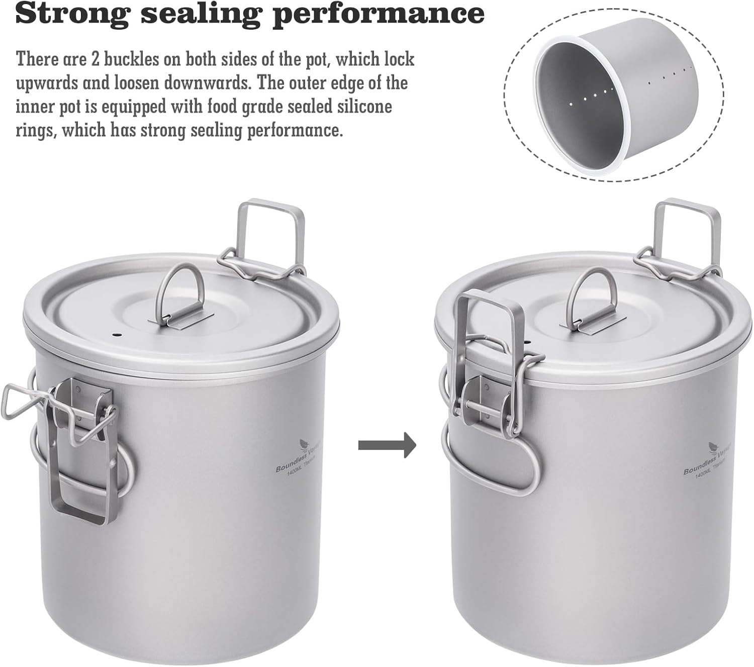 These titanium camping cookware have a collapsible handle for easy storage; There are 2 buckles on both sides of the pot, which lock upwards and loosen downwards; The outer edge of the inner pot is equipped with food grade sealed silicone rings, which has strong sealing performance