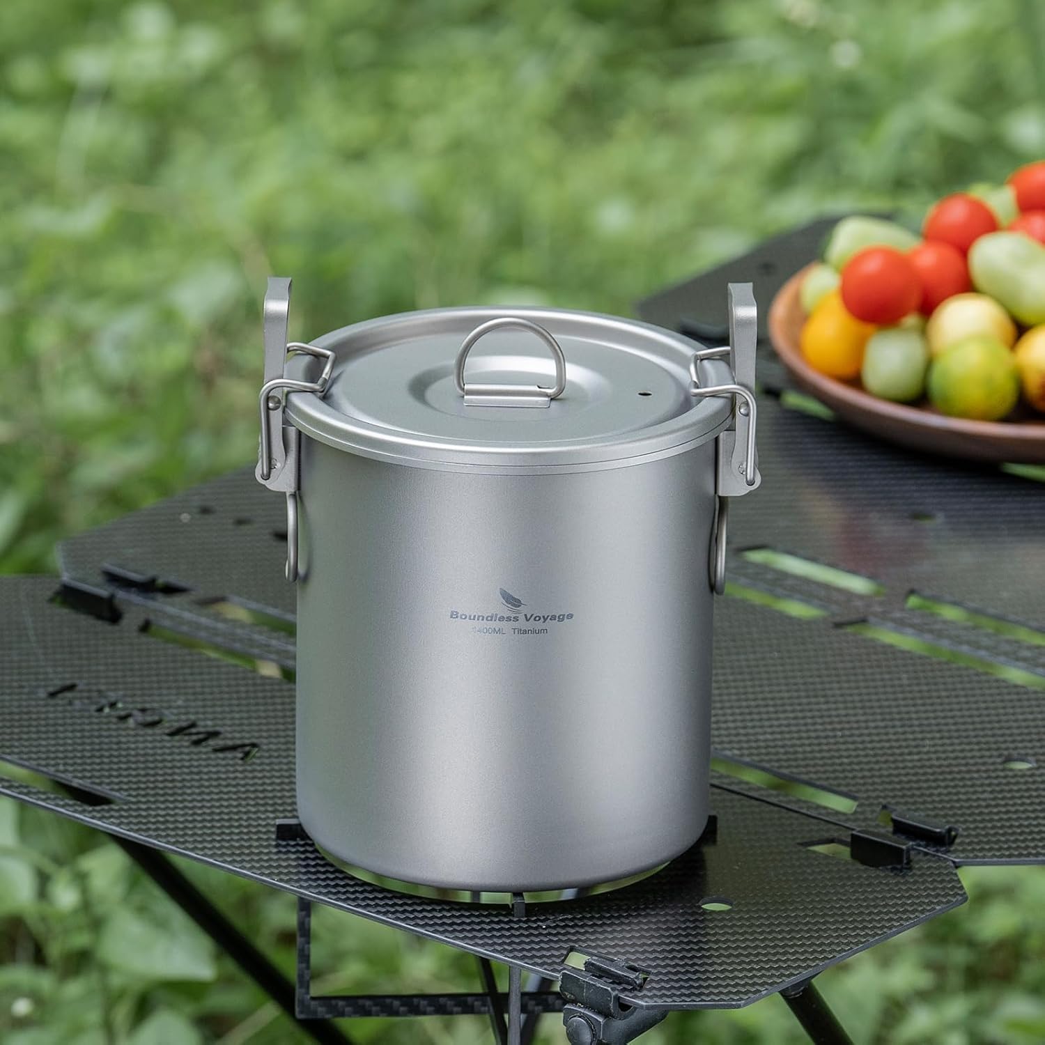 Material: TA1 titanium+food grade silicone ring; Wall thickness: 0.5mm; Packing list: 1.4L outer pot+0.9L inner container+1 carry bag