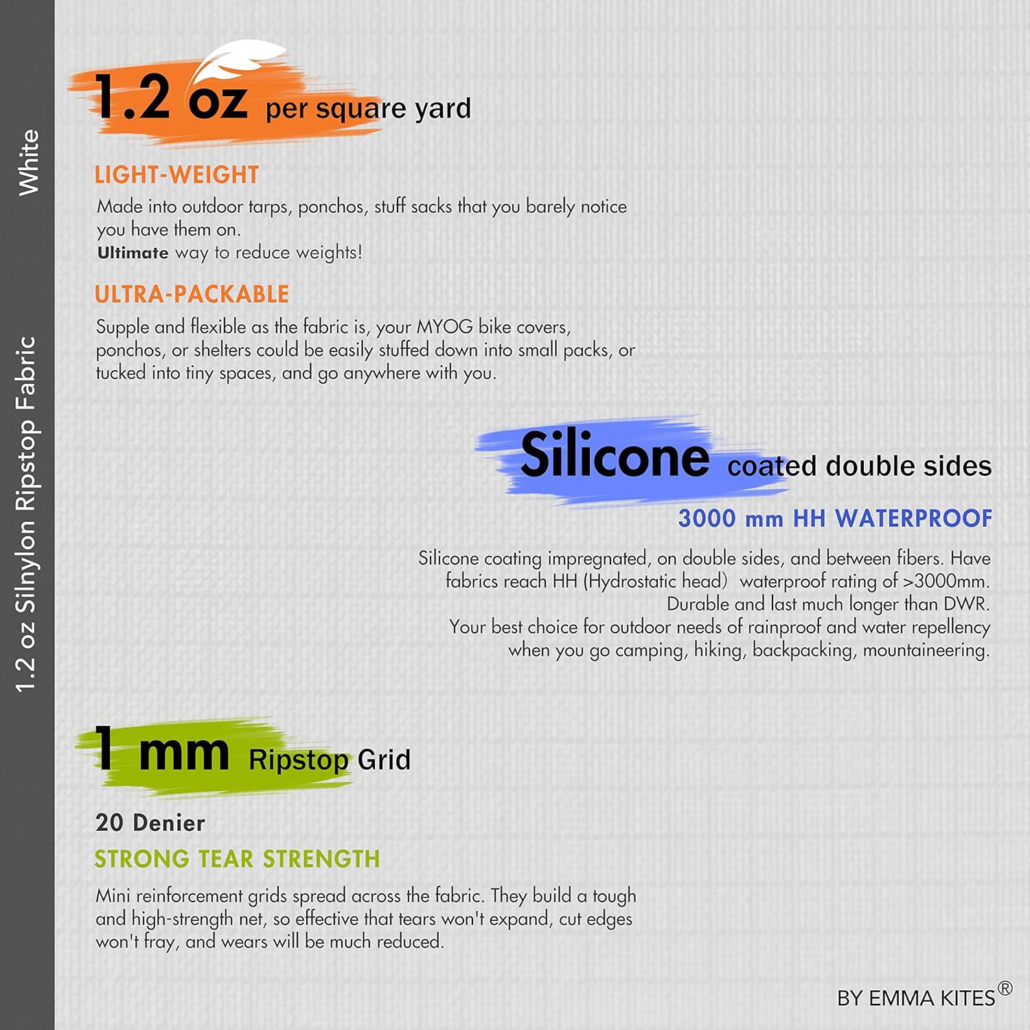 EMMA KITES 1.2 oz Silnylon, 20D ripstop nylon fabric enhanced by Silicone impregnated coating and mini-grids, is highly waterproof, windproof, and offers high tear strength. One of the highest performance fabrics for outdoors to make your tarps, ponchos, tents, backpacks, covers, stuff/gear sacks, and more.