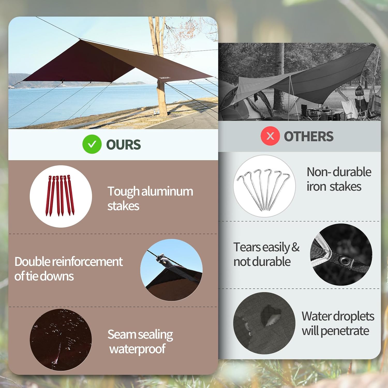 High-quality complete set of accessories: One set can fulfill your camping needs without having to buy any other items. Package includes 1 tent tarp with 19 webbing straps, 6 rust-proof aluminum ground pegs, 8 adjustable nylon ropes, 1 ultralight carry bag for all your belongings, plus a super handy extra carry bag for accessories