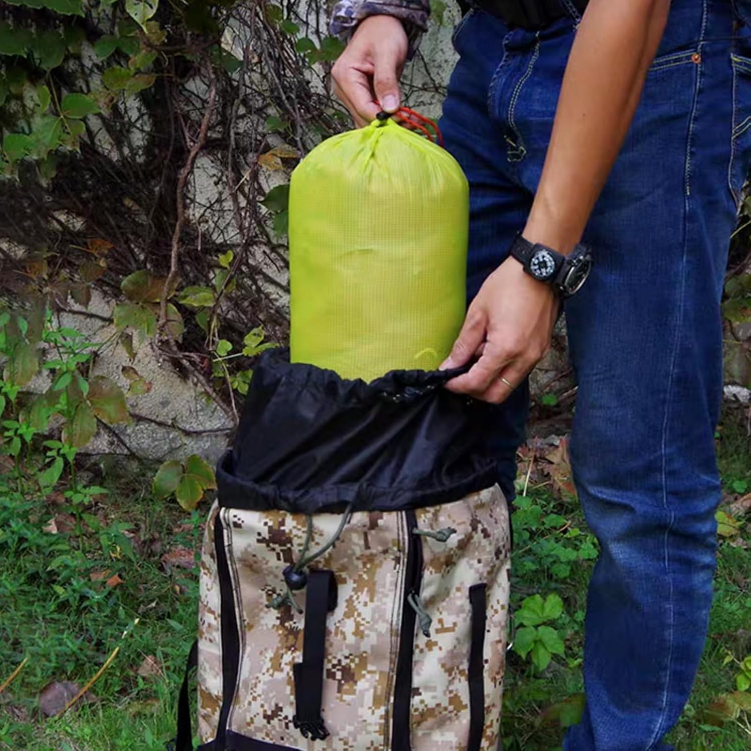 【CLOSURE METHOD】The drawstring is made of abrasion-resistant material, so it won’t be easily damaged during your adventures. In addition, the opening of the stuff bag is designed with rolled edges + double stitching, so you can hang it on your backpack as an extra storage bag.