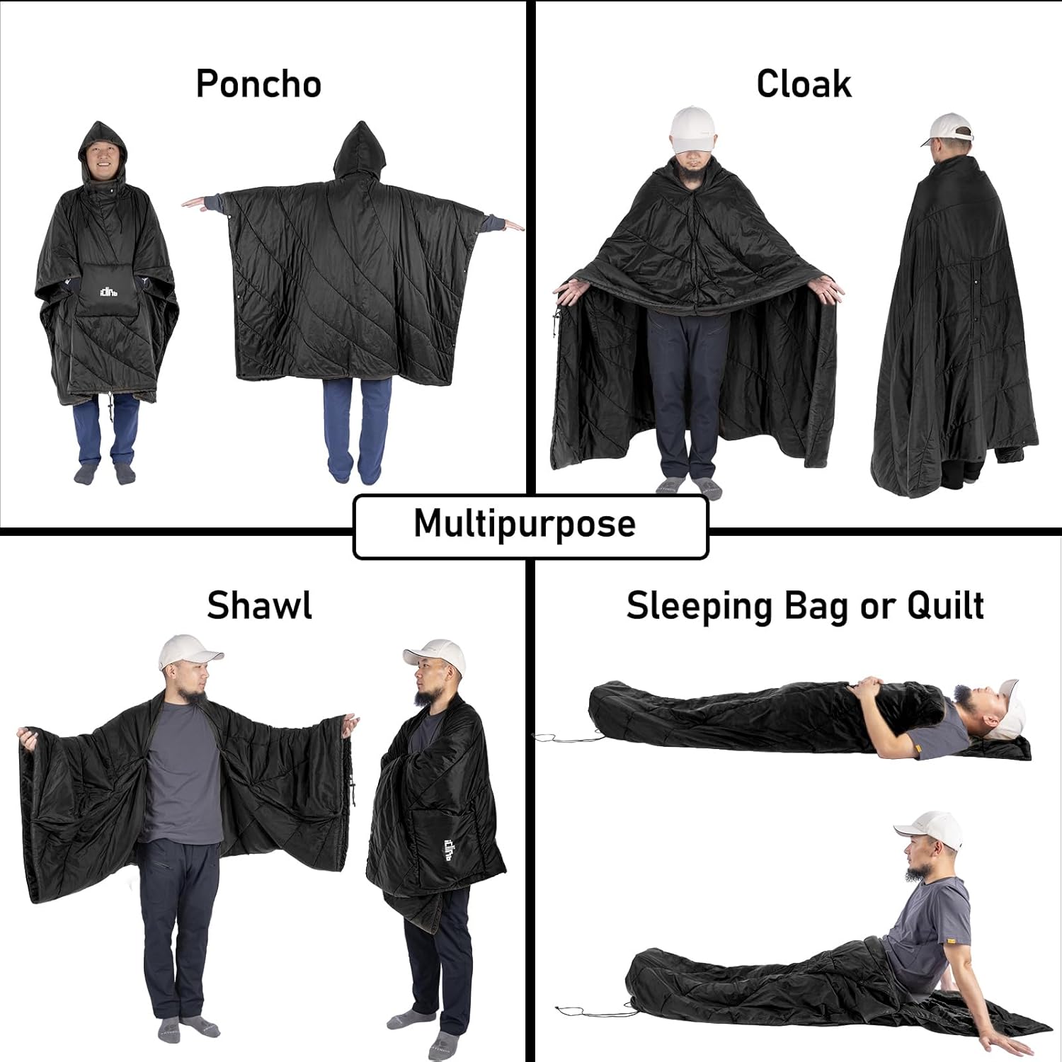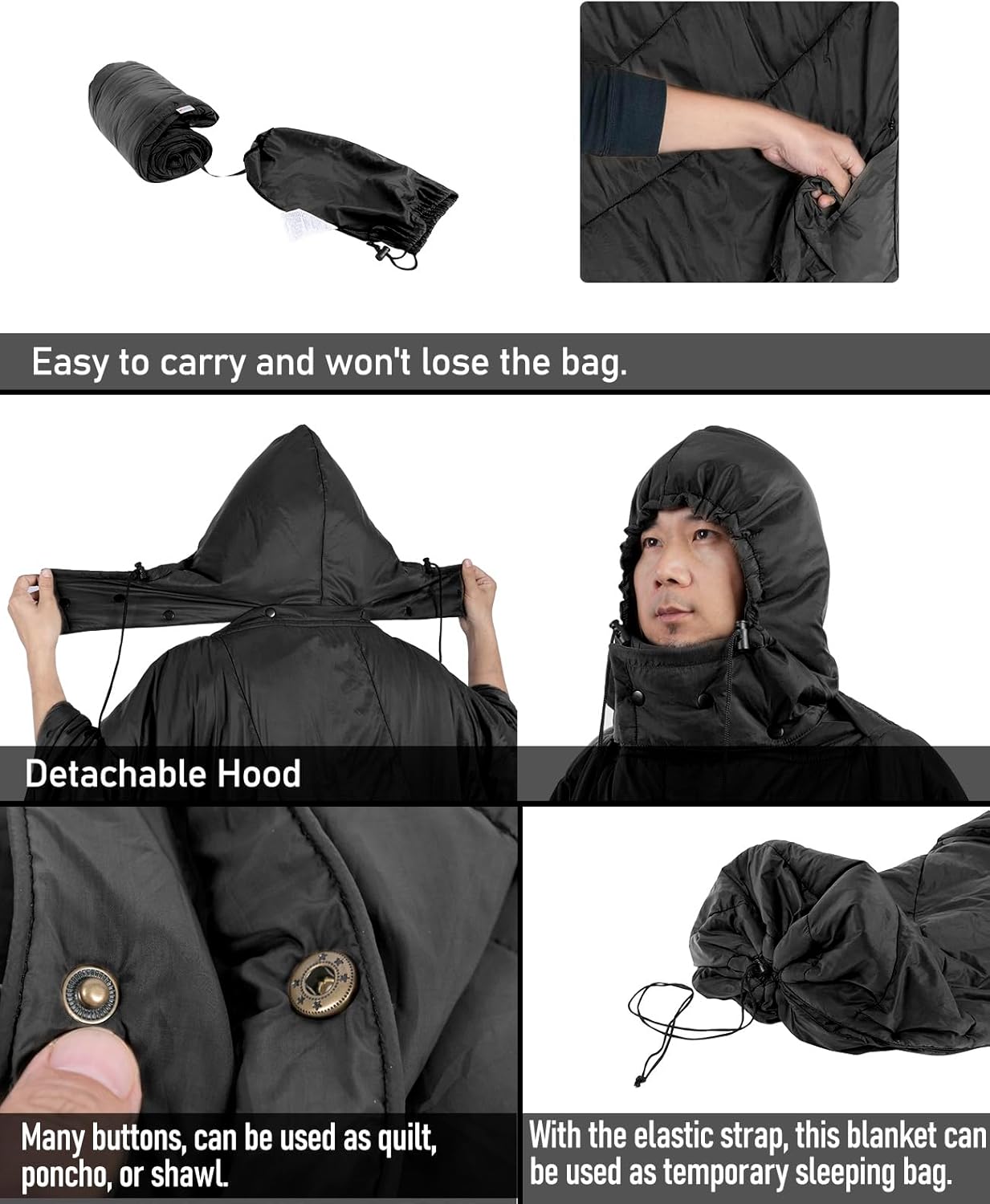 3M Thinsulate Filling Warm yet lightweight, powerful yet thin, it helps trap body heat, while allowing moisture to escape. WATER RESISTANT 100% Polyester, synthetic fibers absorb less than 1% of their weight in water. COMFORTABLE and WINDPROOF 20D nylon fabric, soft, skin-friendly, comfortable, durable, and windproof, take this soft, warm, and spacious blanket with you on the road. LARGE with DETACHABLE HOOD Large enough for big guys, unfold size 78” × 57”; Put on the hood to cover your whole body, free your hands to deal with troubles. ULTRALIGHT, COMPACT Only 1.5 lbs; Small when packed, packed size 13” × 5.5” × 5.5” PORTABLE Stuff bag attached with the blanket, won’t get lost, easy to put in your backpack and carry everywhere. HAND POCKET Front pocket to rest and warm your hand. MACHINE WASHABLE Spot-clean as needed with a damp sponge. Machine-wash only when necessary in a large capacity, front-loading washing machine. Keep the connector cable back inside of the pocket, and make sure the pocket is fully zippered closed before washing the blanket. Select cold water and a delicate cycle with two rinses and an additional spin cycle. MULTIFUNCTIONAL With the buttons, hood and elastic straps, this blanket can be used as quilt, wearable poncho, shawl, temporary sleeping bag, and it won’t slip off your shoulders. Enjoy warmth and comfort in the car, hammock, stadium, office, outdoor around the fire, or at home, reading books, watching shows. sitting backyard, on your couch and sofa, let warmth accompany you anytime anywhere. VERSATILE Great for camping, backpacking, glamping, hiking, fishing, motorcycling, mountaineering, trekking, traveling, bike touring, lounging, picnics, beach trips, concert events, music festivals, airplane trips, snowmobiling, ATVing, snowball fights, snowshoeing, sledding, ice-skating and other outdoor adventuring.