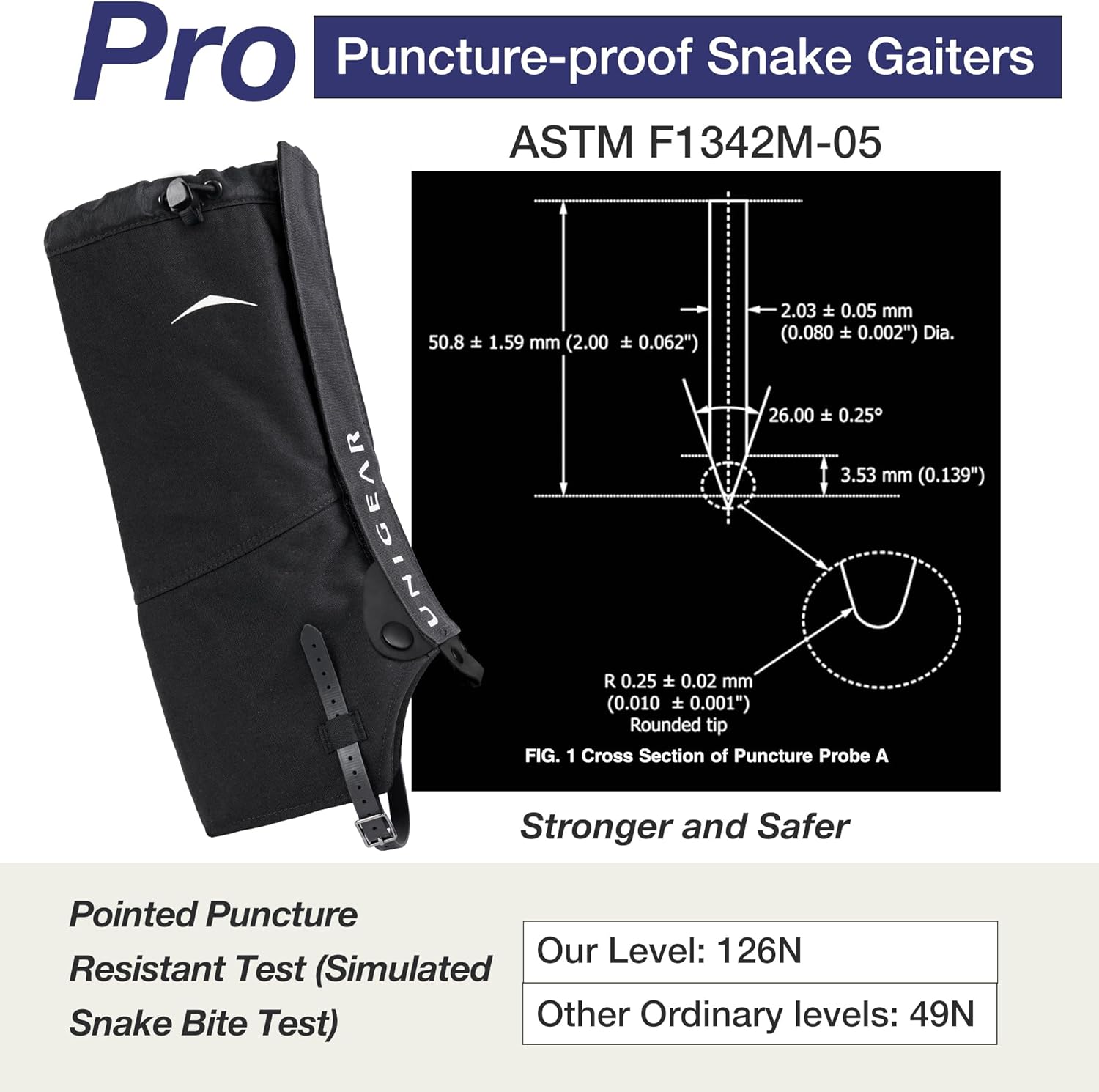 Powerful Snake Protection: Unigear snake gaiters have been tested according to the ASTM F1342M-05, with a puncture resistance of up to 12850gf, far exceeding the 5000gf of PP board snake gaiters. It prevents simulated snake strikes with paired 0.05 mm sharpness instruments, with a weight of 150 grams and 0.59J, providing protection that surpasses the biting force of snakes (700-2000psi, 370-9900gf). It easily protects against cobras and provides ultimate protection in any environment.