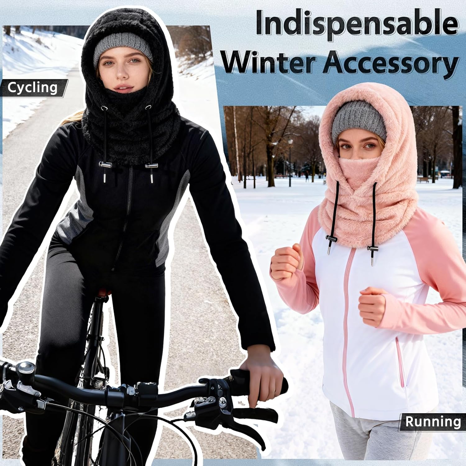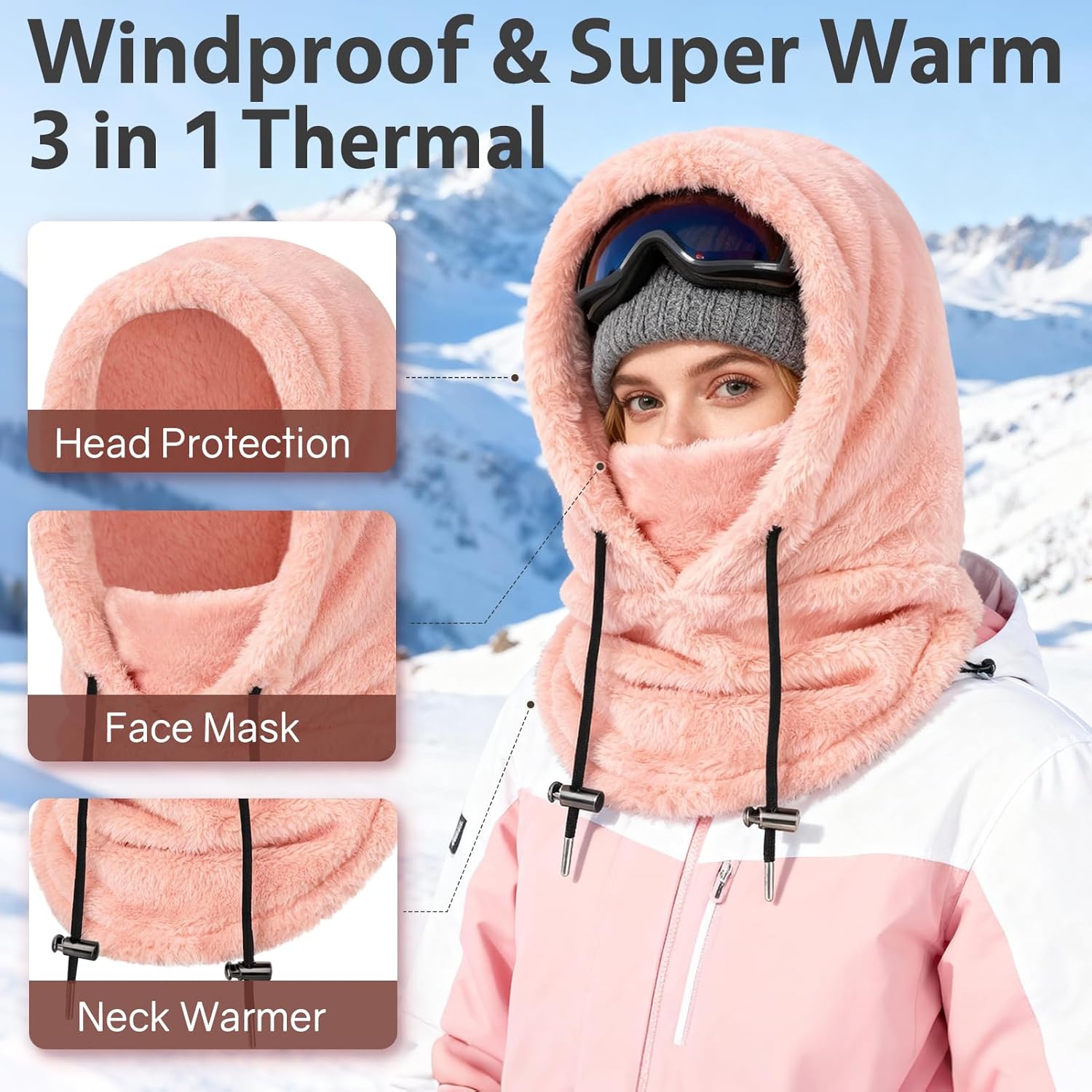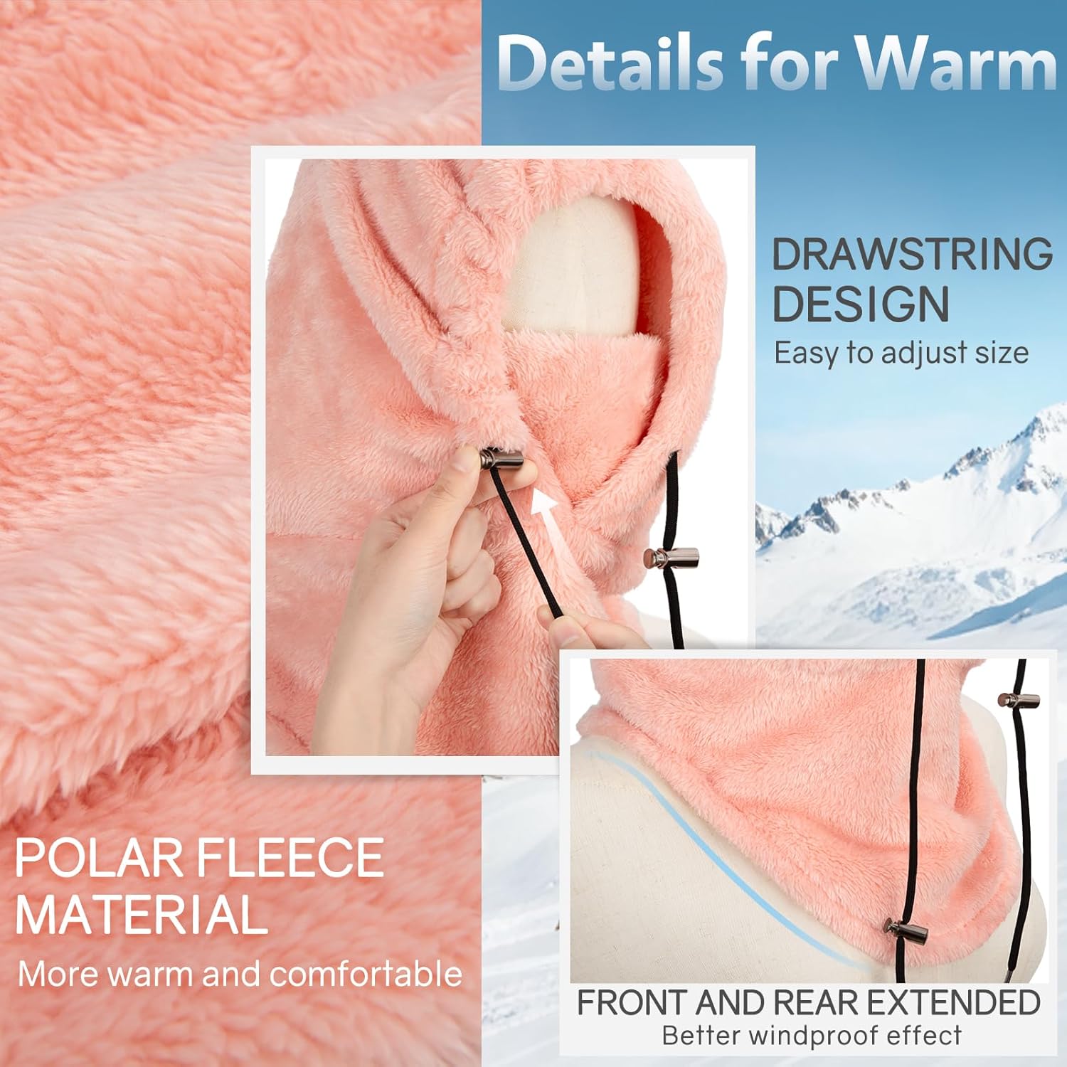 – Thickened fluff design, adjustable drawstring for better fit and windproof
