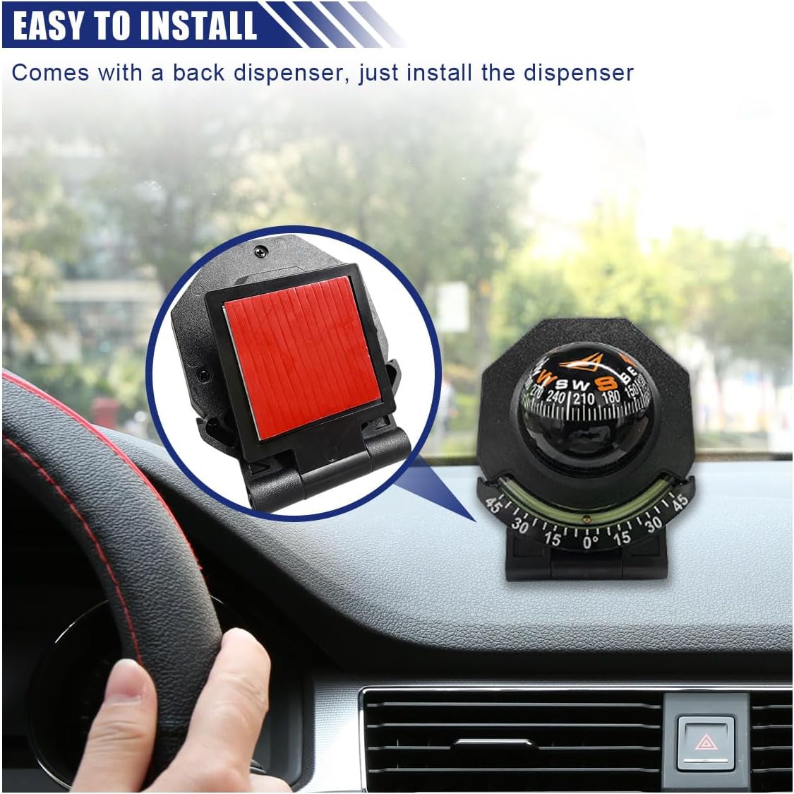 【Easy Installation】: The car compass adopts a self-adhesive design, is easy to install, just tear off the bottom tape protection film, can be easily installed on the car dashboard or windshield, easy to remove, so that you can flexibly switch between different vehicles to use.