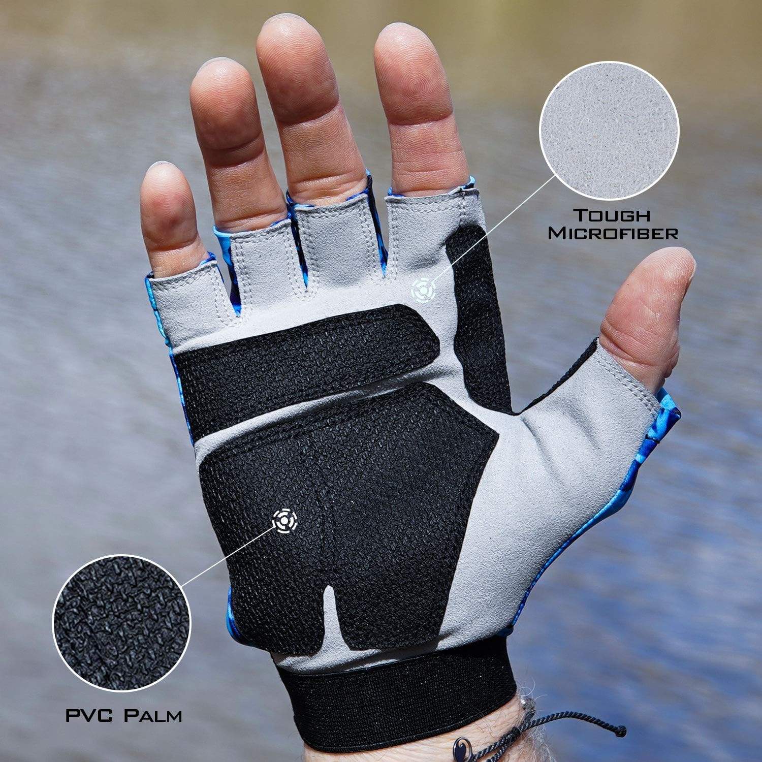 Double Layer Palm – Two layers of material protects your hands from spiny fish and help to extend the life of your gloves because of the extra padding. A microfiber layer allows for natural hand movement and the PVC layer prevents cuts and scrapes. Integrated pull loops on the fingers make it easy to take off your gloves and the hook and loop wrist strap keeps them from slipping off. They are excellent for added protection as cold weather fishing gloves.
