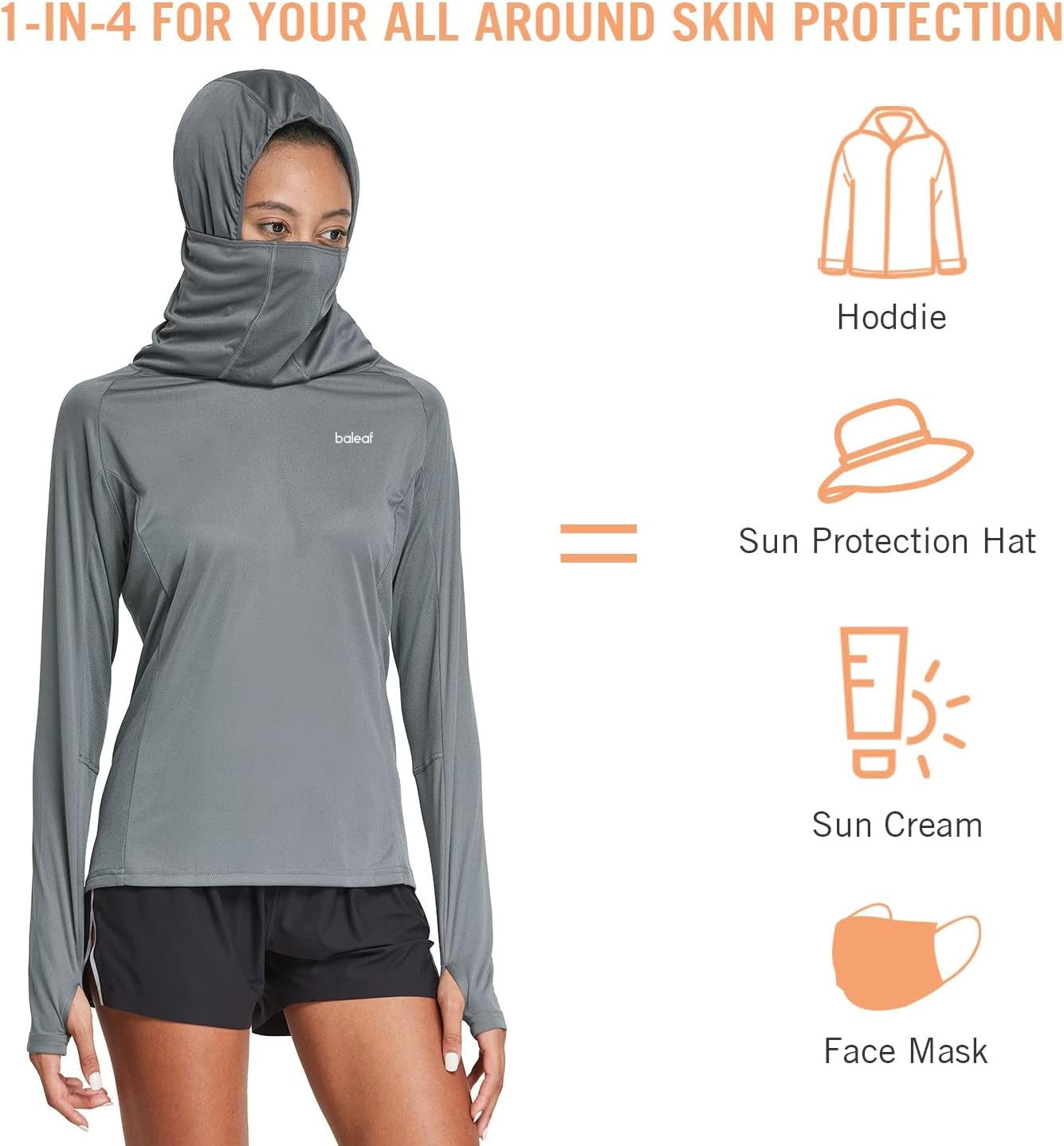 BALEAF Women’s Long Sleeve Hoodie Shirts with Face Cover is dedicate to providing breathable and sun protection shirts for your outdoor activities. This hoodie shirt featuring windproof and UPF50+ for your facial, neck, and head for all-around protection from the sun’s harmful UVA/UVB rays.