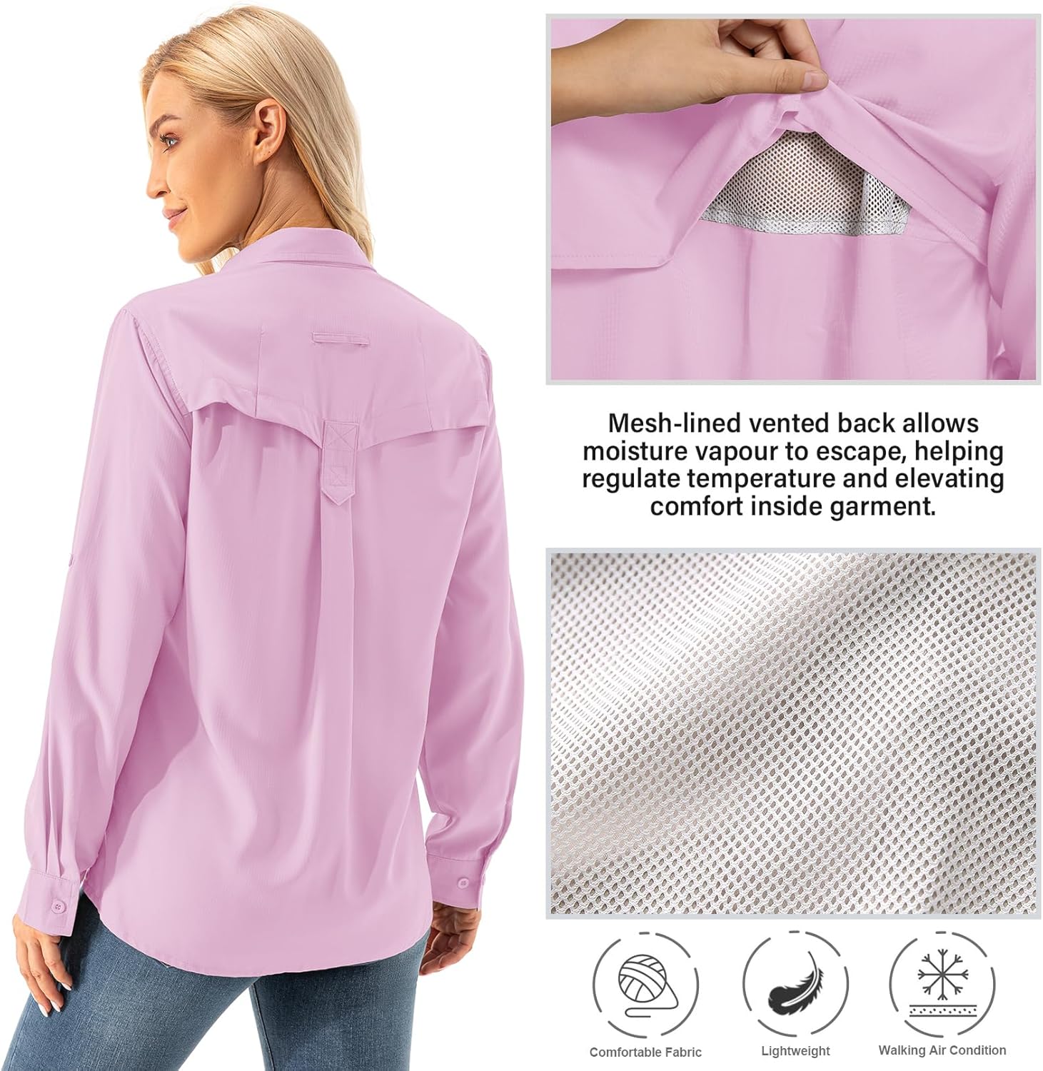 UPF 50 shirt blocks UVA and UBA ray to help prevent sunburn and skin damage during long hours in the sun.Women’s SPF safari shirt features buttons at arms to convert long sleeves to short sleeves for hotter days.Long sleeve women’s fishing shirt features quick dry fabric and Back Vents for ultimate breathability and comfort.Roll up to short sleeve shirt, casual clothes features a relaxed, lightweight fit for maximum comfort during outdoor activities.Ideal for hiking, trekking, climbing, traveling, camping, mountaineering, fishing, suitable for Spring/Summer/Autumn.With a modern classic fit, this long sleeve shirt is ultra-light and comfortable enough for maximum activity.100% Polyester, Quick dry fabric, Machine Wash.