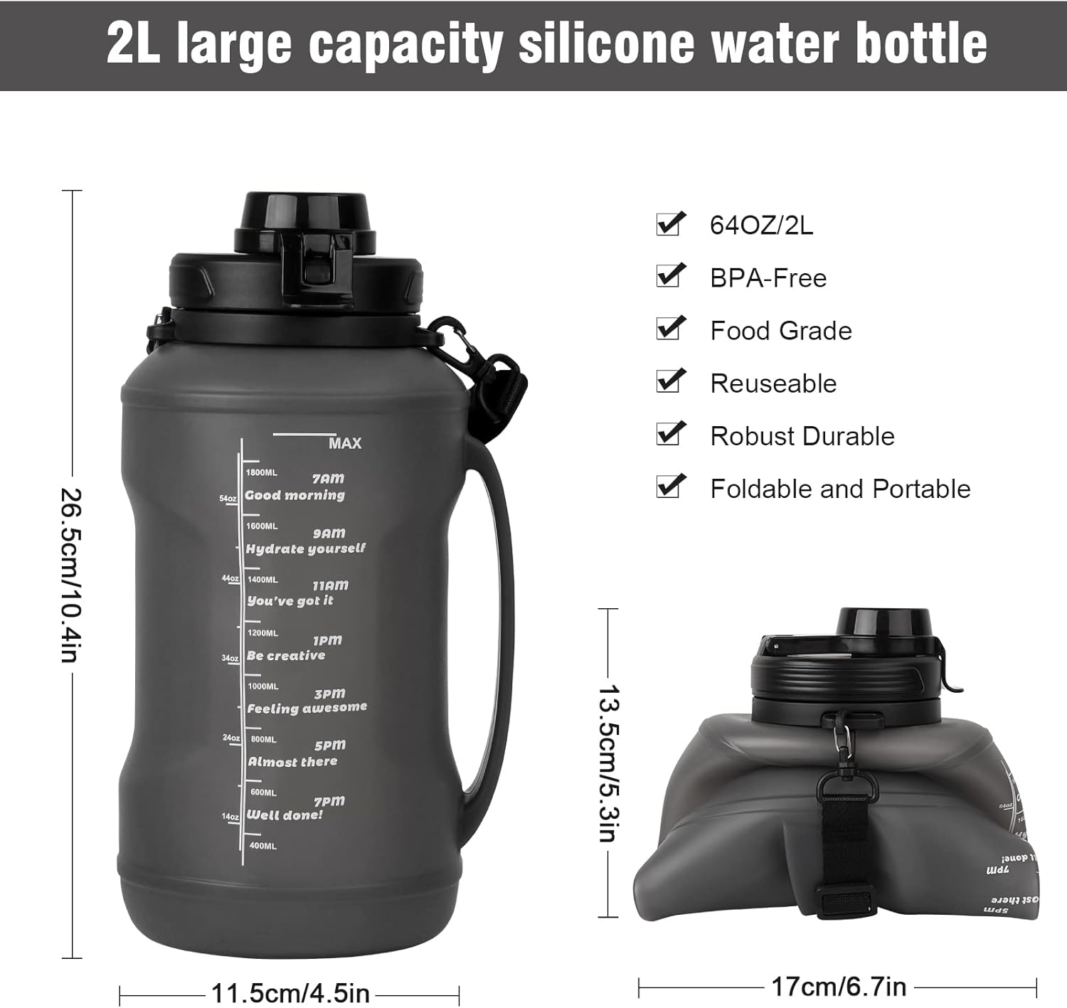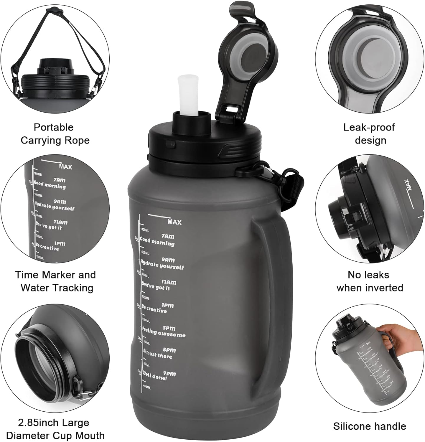 Large Capacity: 2L/64OZ water bottle with built-in silicone gasket and snap spout design to prevent leaks and spills.
