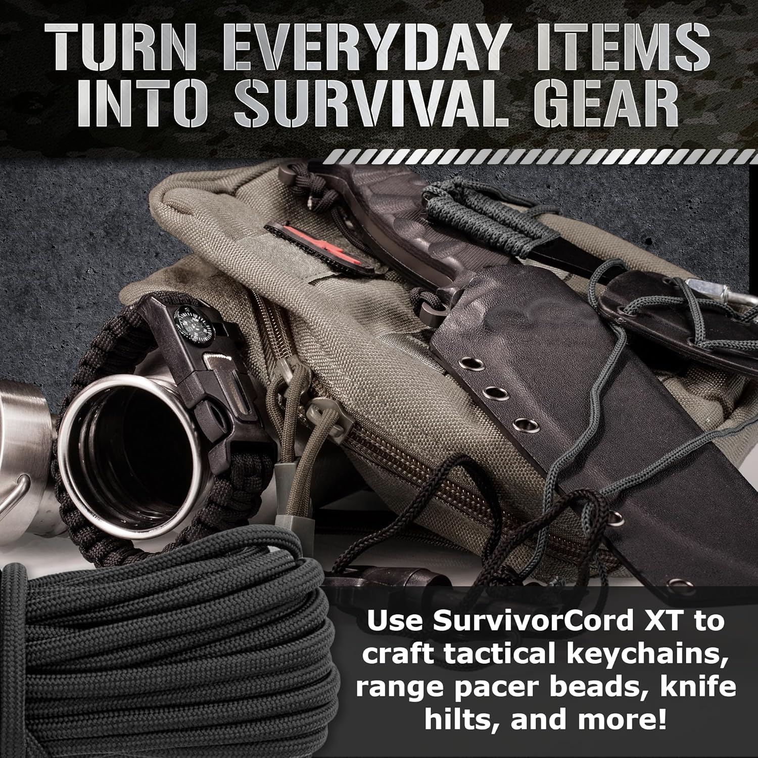 Paracord with 3 inner cords: Fishing Line, Waterproof Fire Tinder, and a Kevlar Utility Strand Paracord with 3 inner cords: Multi-Purpose Utility Wire, Fishing Line, and Waterproof Fire-Tinder Built to last bungee cord, tightly woven from a 16-strand nylon sheath, with a 12-strand 100% rubber core. All-in-1 featuring SurvivorCord Handle with Utility Wire, Fishing Line, and Waterproof Fire-Tinder Multi-Purpose Utility Wire, Fishing Line, and Waterproof Fire-Tinder Can hold up to 1,650 lbs. in an emergency; fits most paracord bracelet and survival bracelet configurations