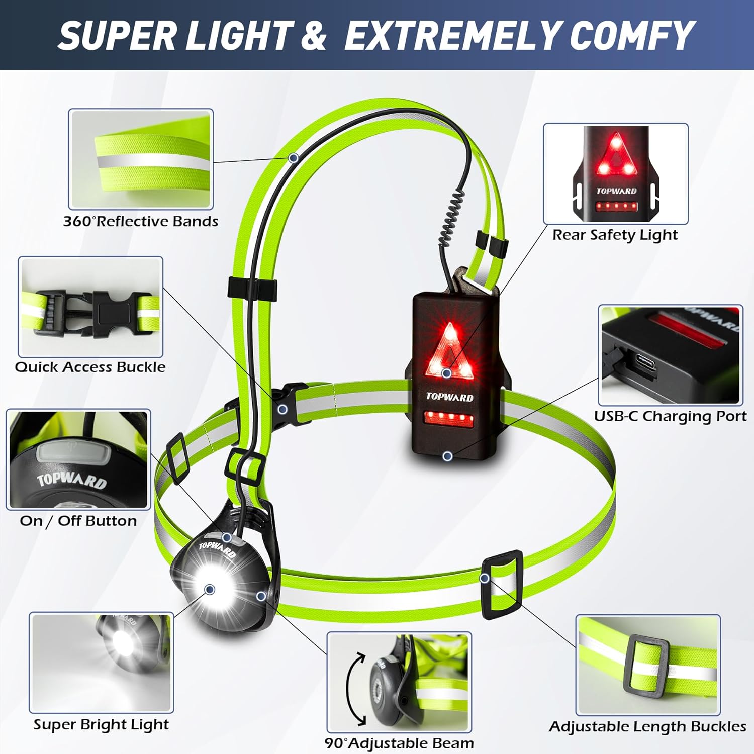 SAFETY HANDSFREE RUNNING LIGHT: High visibility 500 lumen chest front lamp with back safe red light and reflective reflectors on straps for 360°visible. You will be seen well from hundreds of meters away. And when the light is not on, straps work as a reflective vest. You won’t need other reflective gears or headlamps any more.