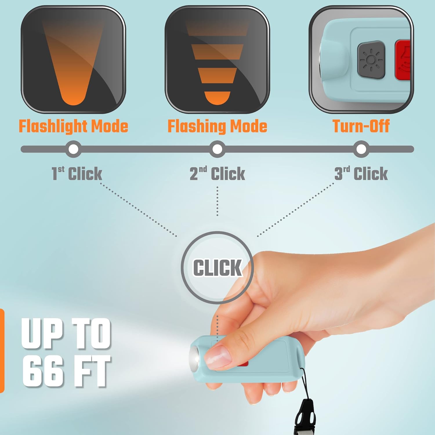 Click the light button to activate the regular mode, second click will activate the flashing mode.
