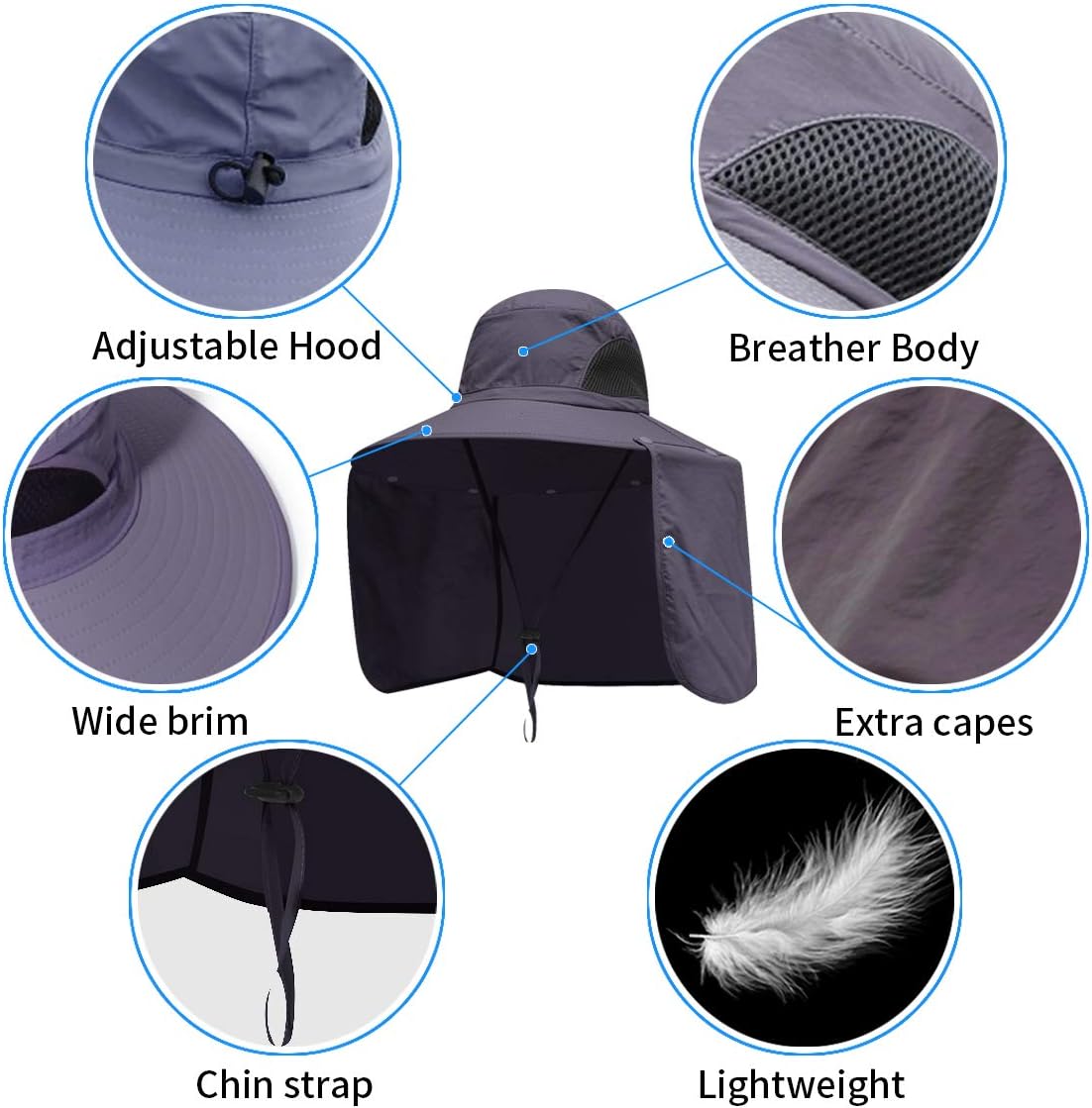 240 degree sun protection special for neck cover.Alomost 10cm brim are great to offers enough of shade to defend your head from fierce sun.There are two mesh holds at two sides to get in air,keep our head always dry. Fabric type