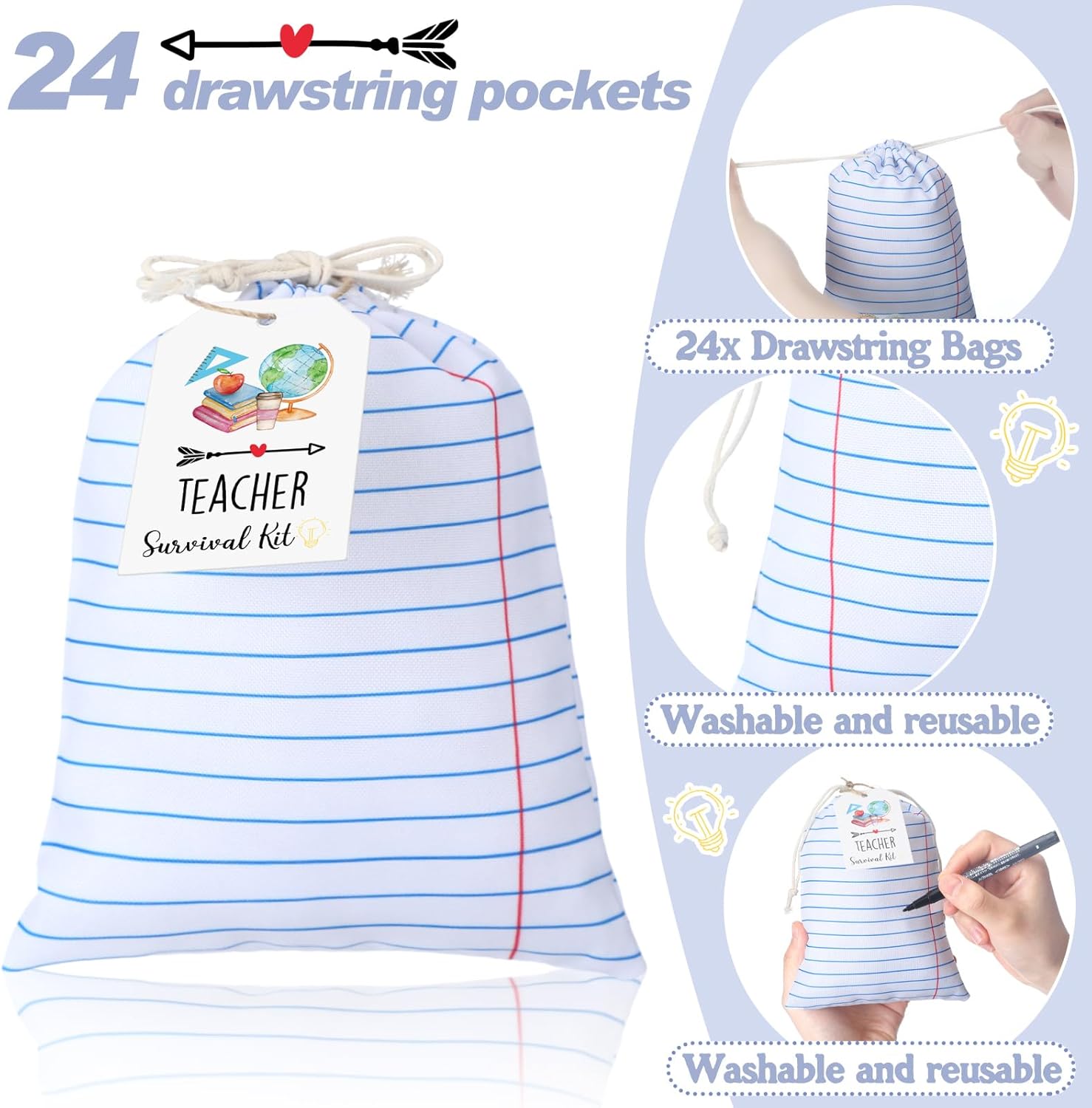 Practical Pockets: this set contains 24 sets of teacher survival drawstring bags and teachers’ survival first-aid cardboard, which can easily hold all kinds of small gifts, stationery, etc.; The drawstring bags are designed to be easy to carry and store; Whether it is a large-scale teacher gratitude activity organized by the school or a class group thanking teachers