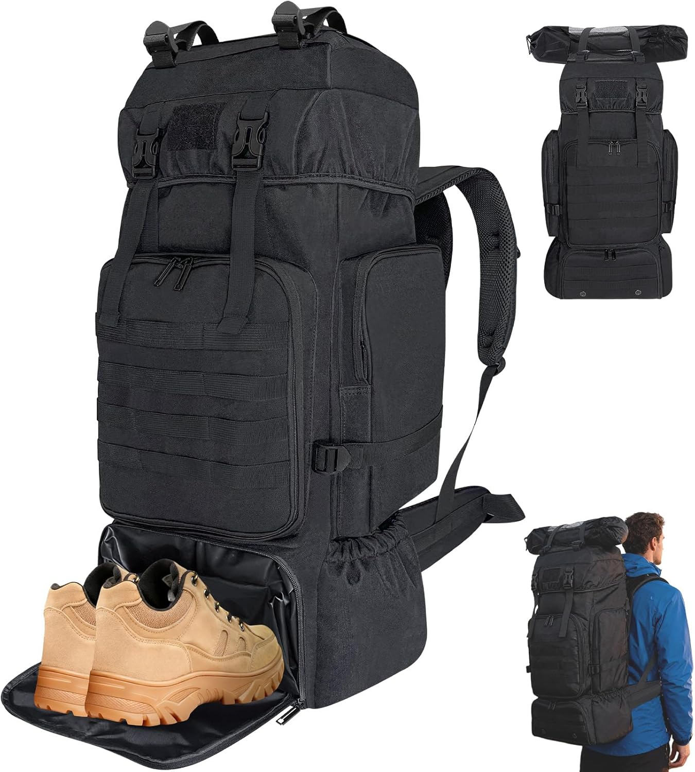 Large Capacity & Organization: This 70L camping backpack offers ample storage with a multi-compartment design, featuring a main drawstring compartment, a top zippered pocket, a front zipper pocket, two side zippered pockets, two stretch side pockets, and a dedicated shoe compartment. The spacious layout allows you to neatly organize and carry all your outing essentials with ease.