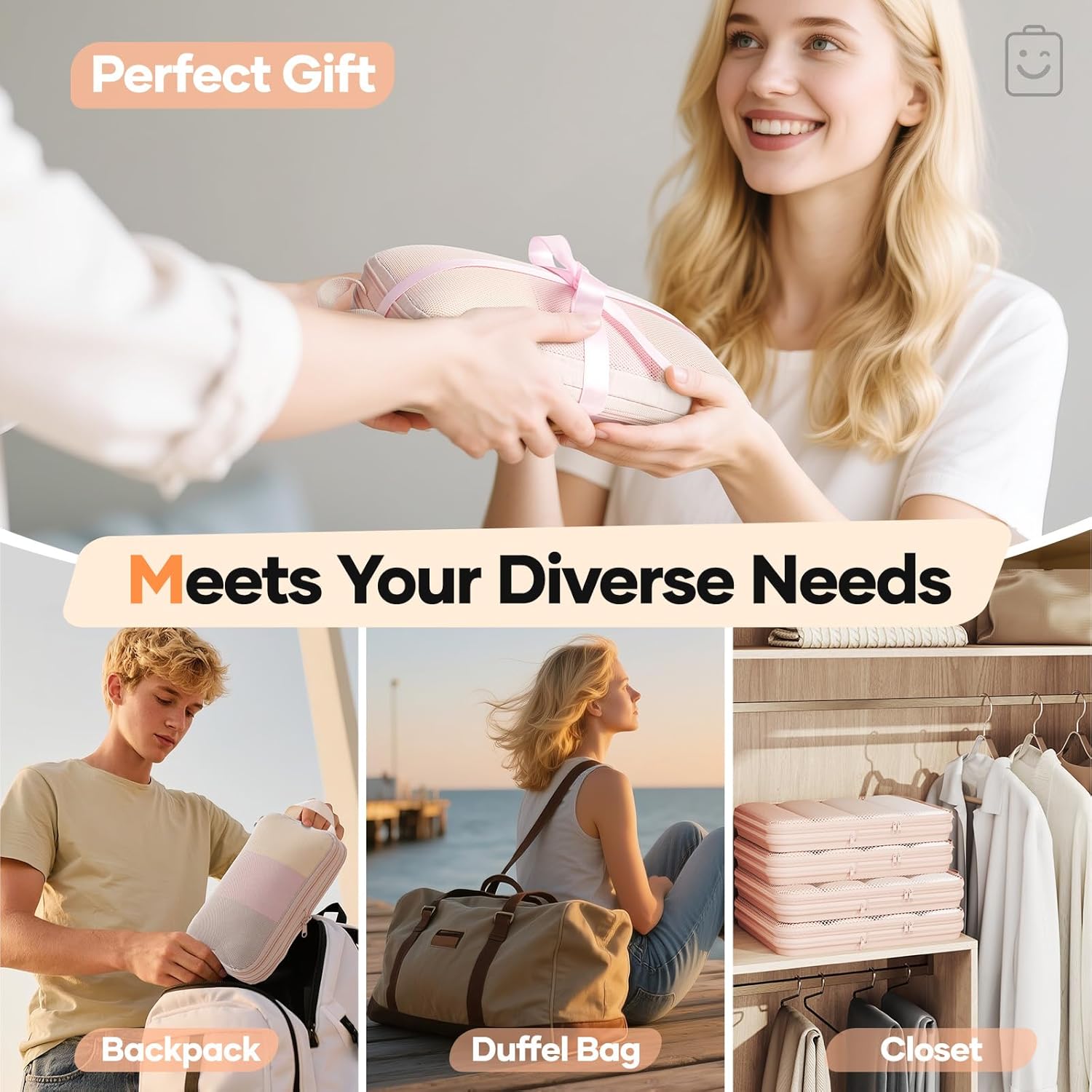 Your Portable Travel Wardrobe – This 6-piece set includes 6 compression cubes in four sizes (S, M×2, L×2, XL) to keep your luggage tidy and organized. The S cube organizes small items like underwear and socks; the M cube fits T-shirts and shirts; the L cube holds jeans and light sweaters; while the XL cube accommodates bulkier clothing such as coats and sweaters.