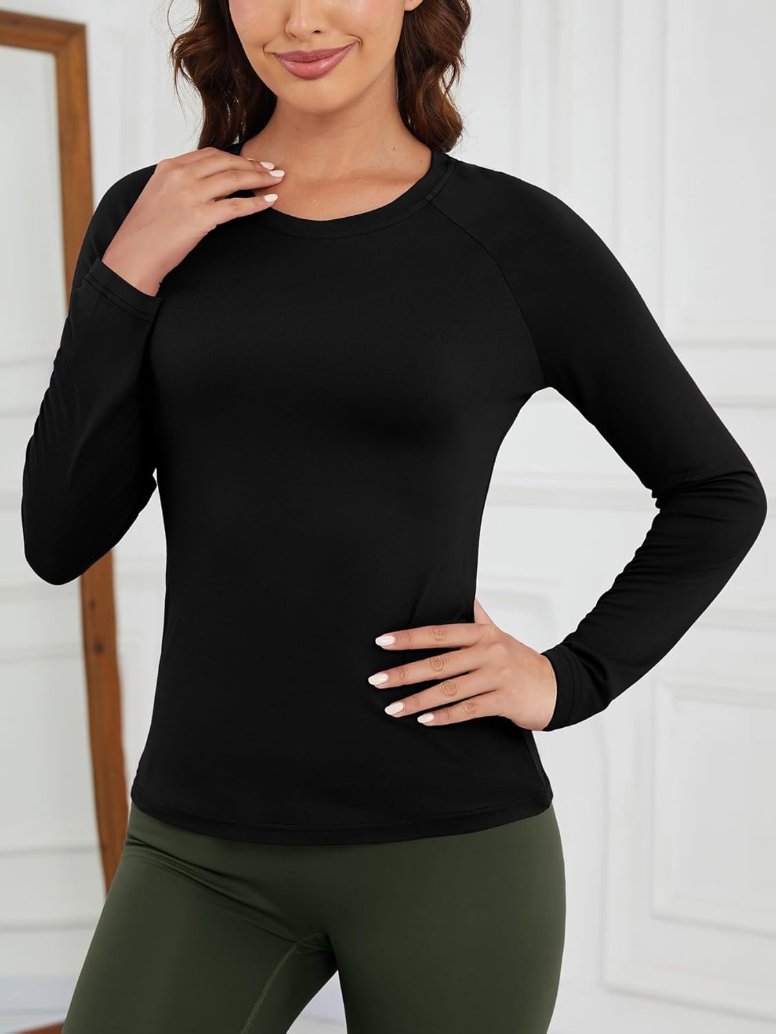 Crewneck Design:Our basic layer thermal shirts was used simple and generous crewneck design, showing elegant temperament for women. It can not only modify the face shape, but also increase the fashion sense of the overall shape.