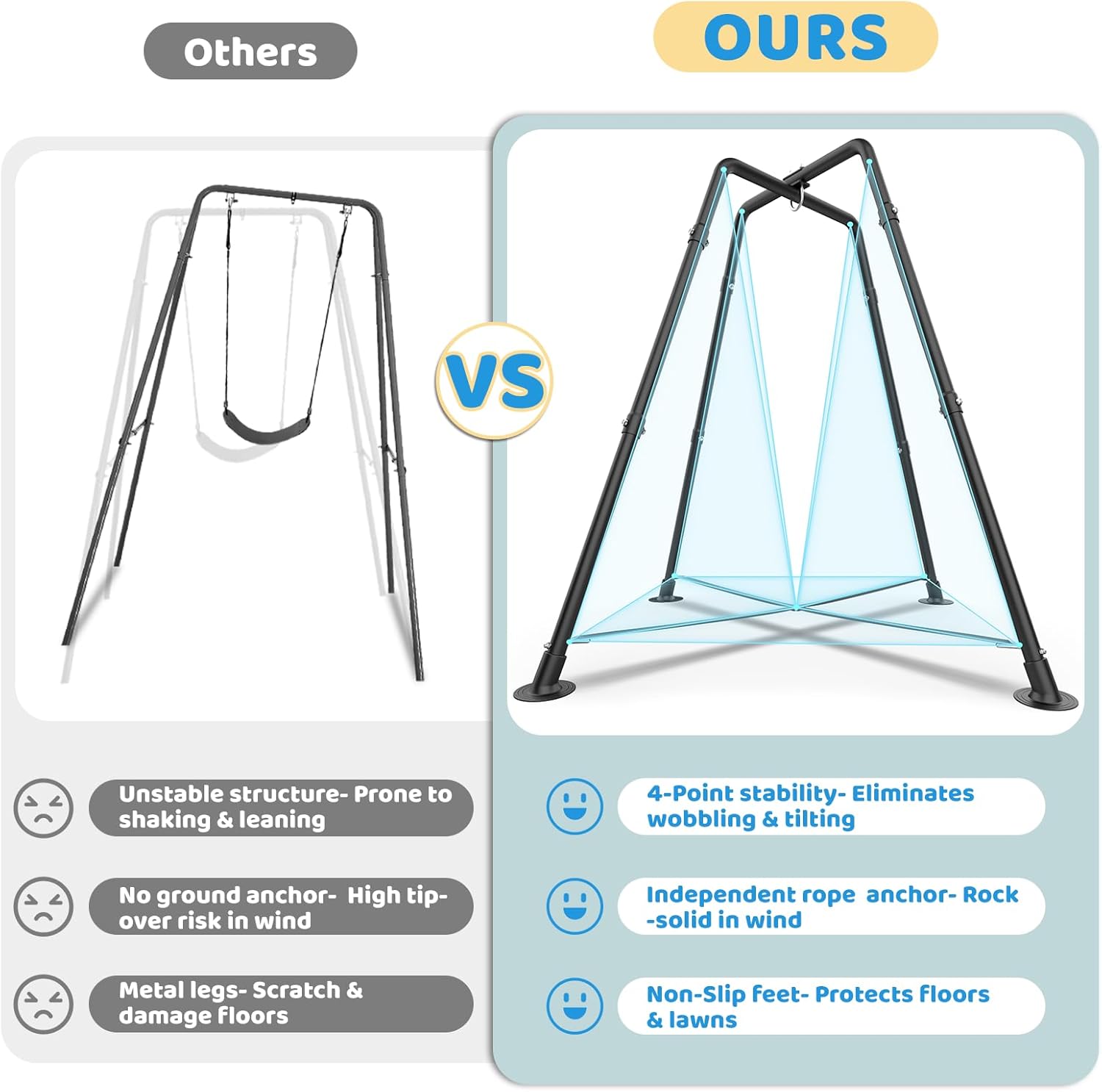 Sturdy Swing Frame: The swing stand is made of thickened steel pipes (diameter 32mm/1.26inch) with a rust-resistant and weather-resistant powder coating. It also offers greater expansion space (footprint 59.8*59.8 inches), providing a safer play area for families