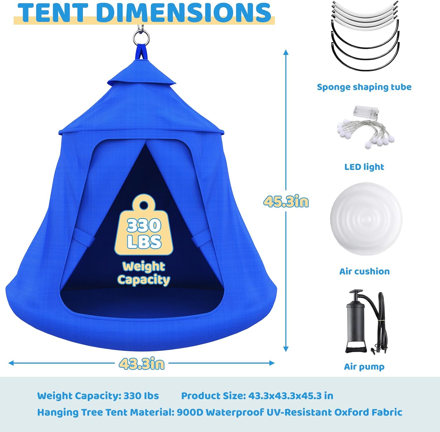 Hanging chair with stand: The tent swing’s base pipes are covered with foam sleeves to added comfort and safety.. The inflatable cushion is soft and comfortable, and an air pump is provided for quick inflation. An LED rainbow light strip (2 AA batteries not included) is included to enhance the ambiance