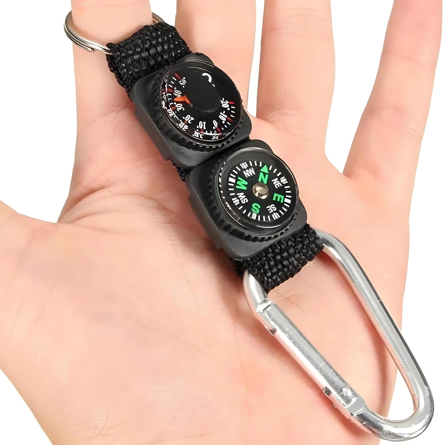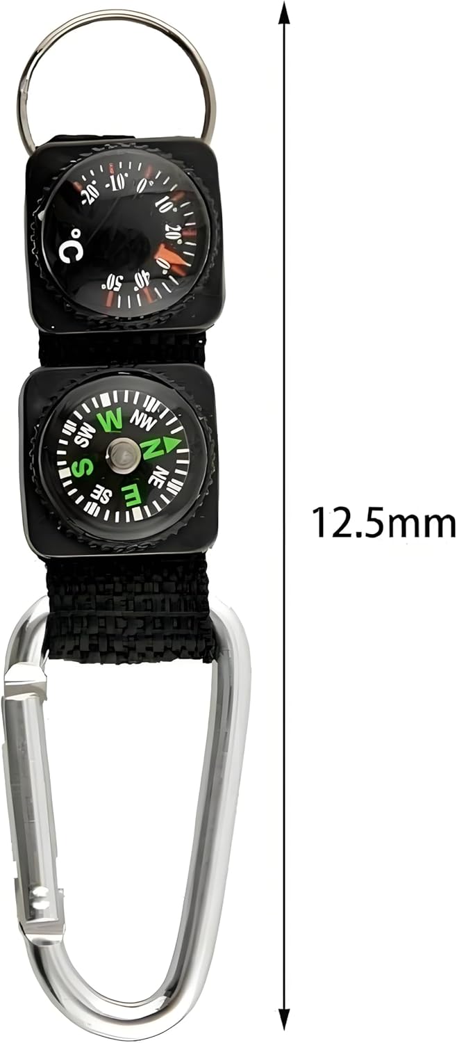 MULTIFUNCTIONAL DESIGN: Combines a sturdy carabiner clip with built-in compass and thermometer for outdoor activities and everyday carry