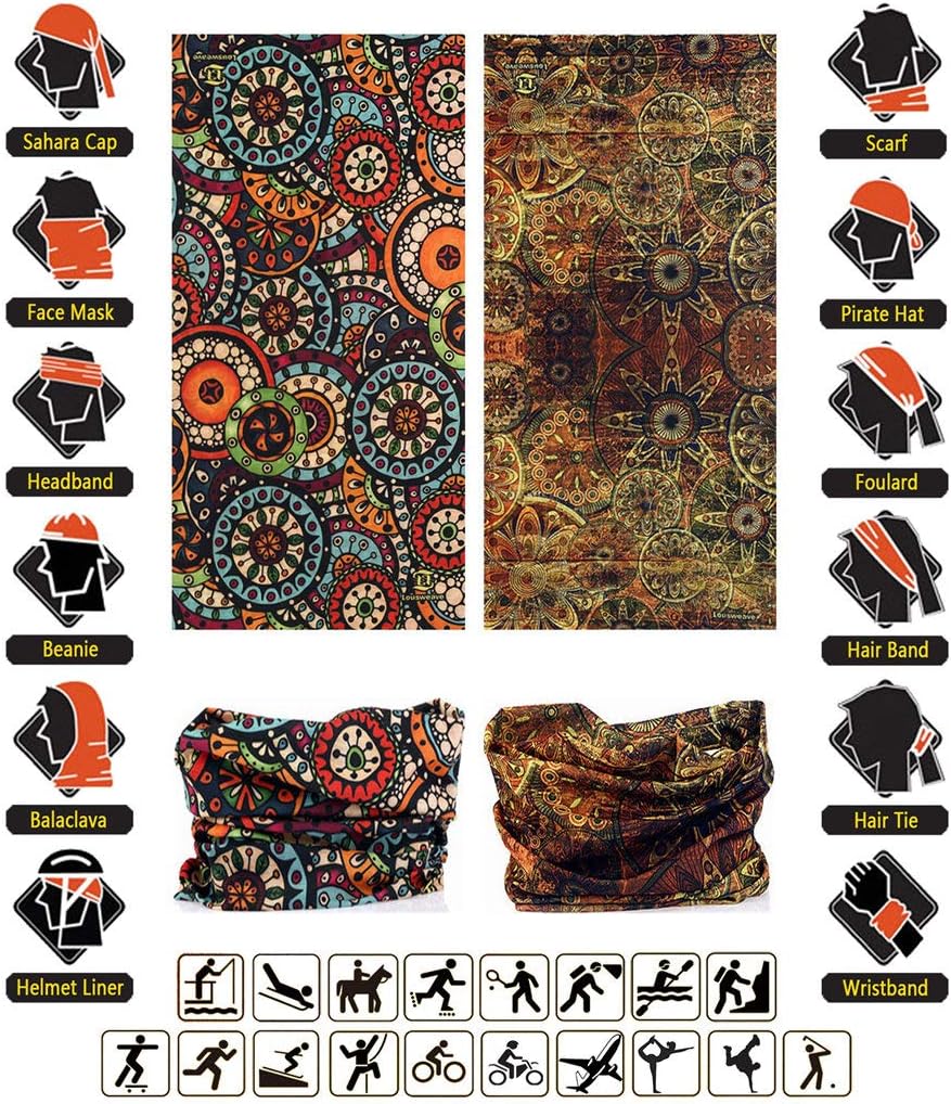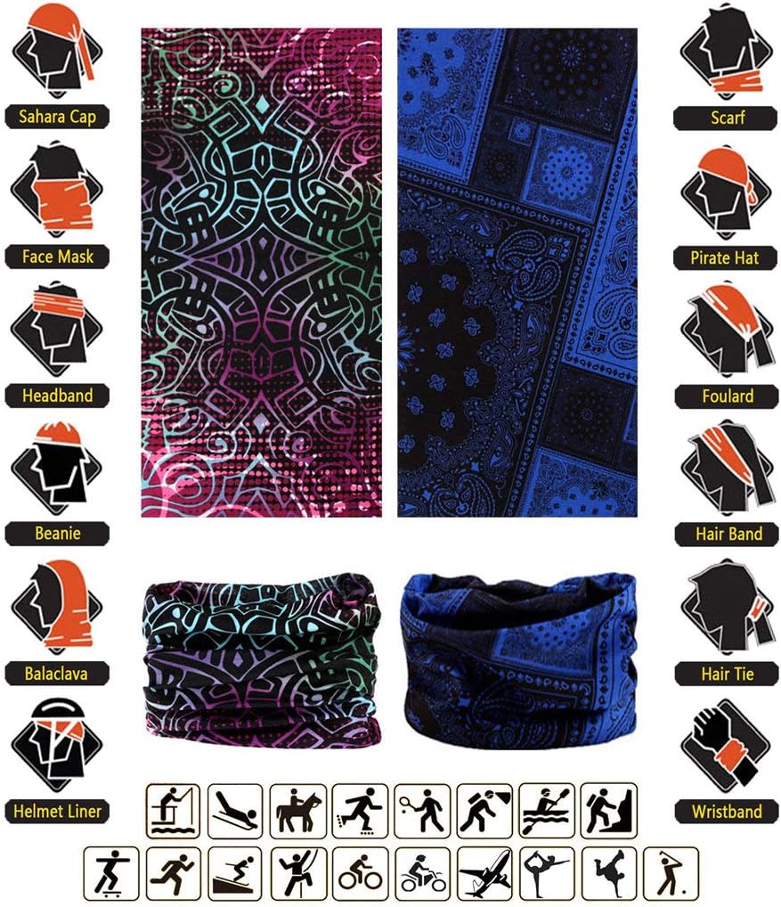 1. SERIES AND MULTIFUNCTION—-With 32 series and 200 designs for you, we designed and modified products geared to the use experience and taste of North Americans. Produces could be worn like as: mask, headband, hairband, Head wrap, bandelet, neckband, armband, waistband, bandana, scarf, handkerchief ,hat& more(12-in-1).