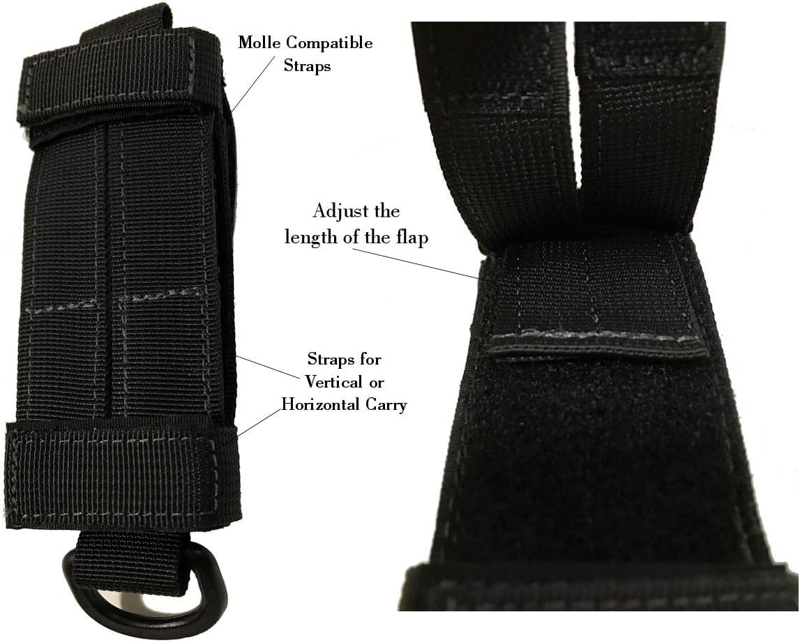 The 2 vertical straps are used for carrying on a belt or for attaching to tactical pouches. You are able to slip the straps through 2 of the PALS webbing to secure it to your pouch. The horizontal strap on the bottom will close for even more retention.