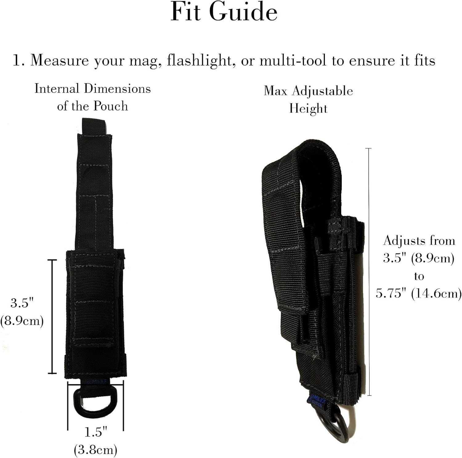Use the Miles Mag Pouch to hold a spare magazine or multitool The flap cover will extend out to 5.75″ by adjusting it up and down on the back of the pouch.