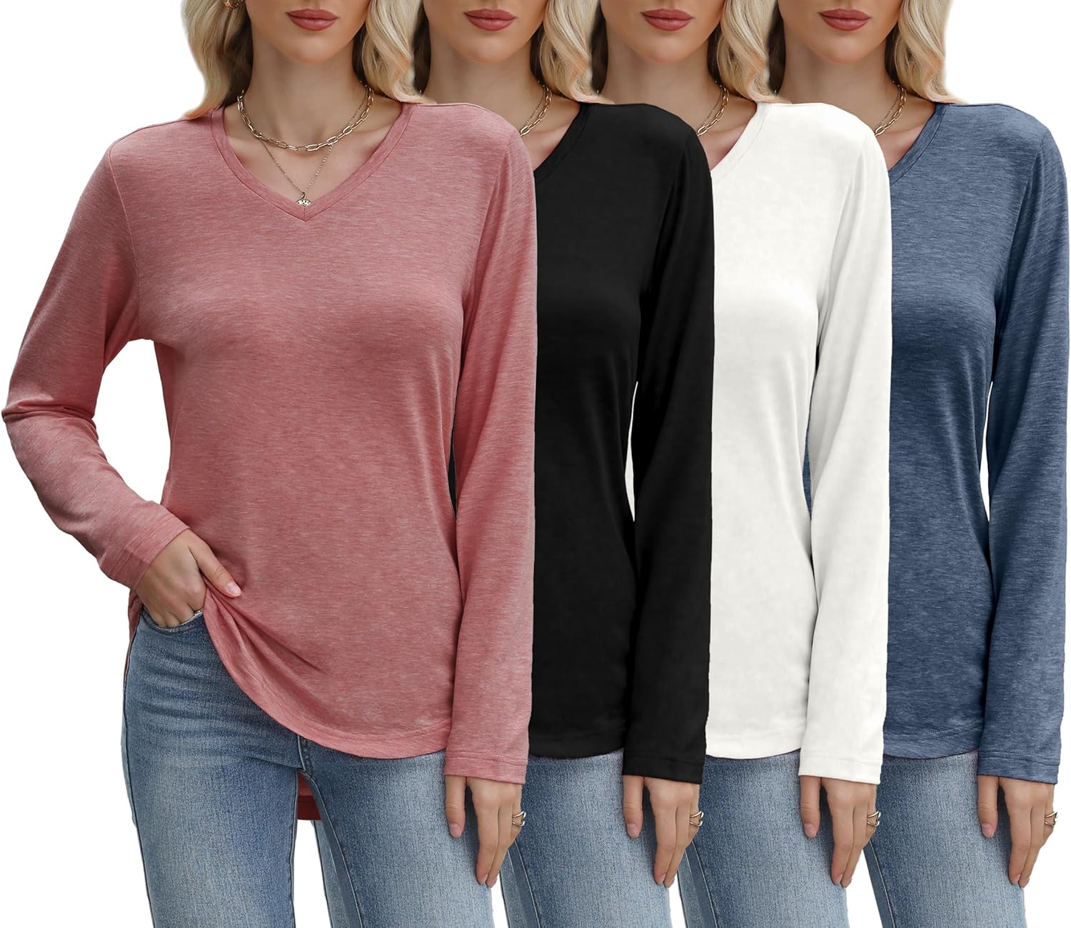 VILIGO Women’s Long Sleeve V Neck Curved Hem Shirts Tops Casual Fall 4 Pack