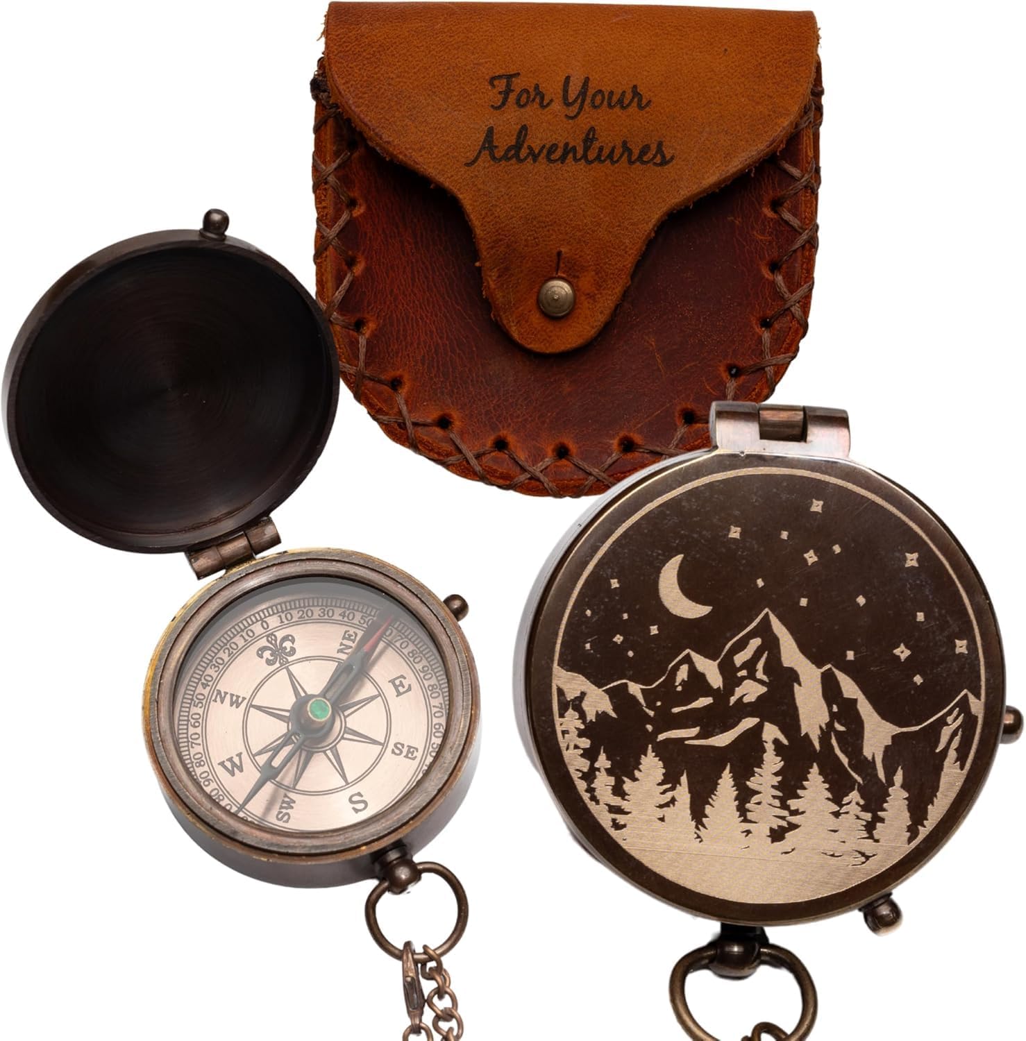 【Moon & Stars Engraved Pocket Compass】Vintage brass engraved compass gift for men featuring mountain, moon, and stars design. A meaningful pocket compass for men who love hiking, travel, and exploration. Thoughtful for a husband, dad, son, or boyfriend