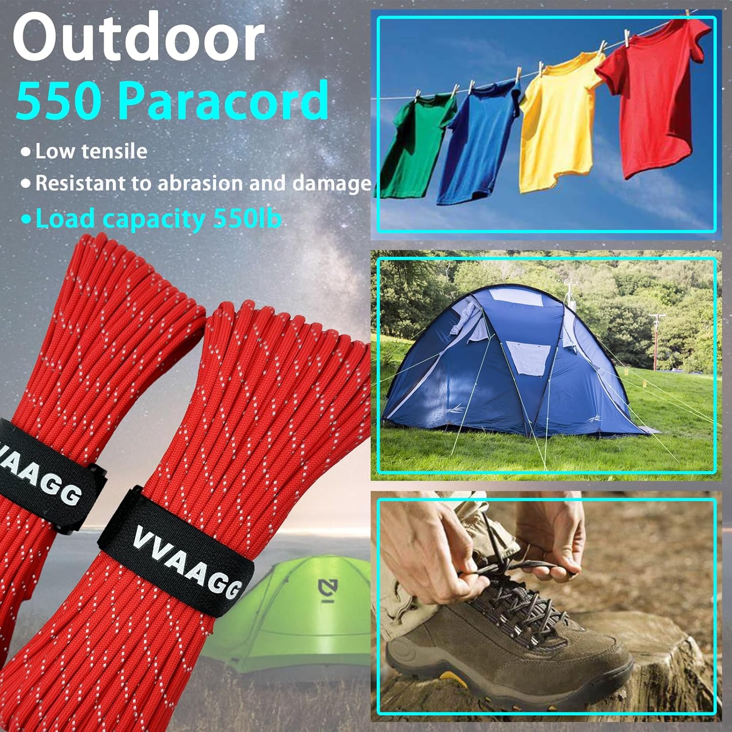 The 550 parachord 100 Feet can be used for a wide range of applications, such as DIY projects, camping, tent setup, and even as a clothesline.