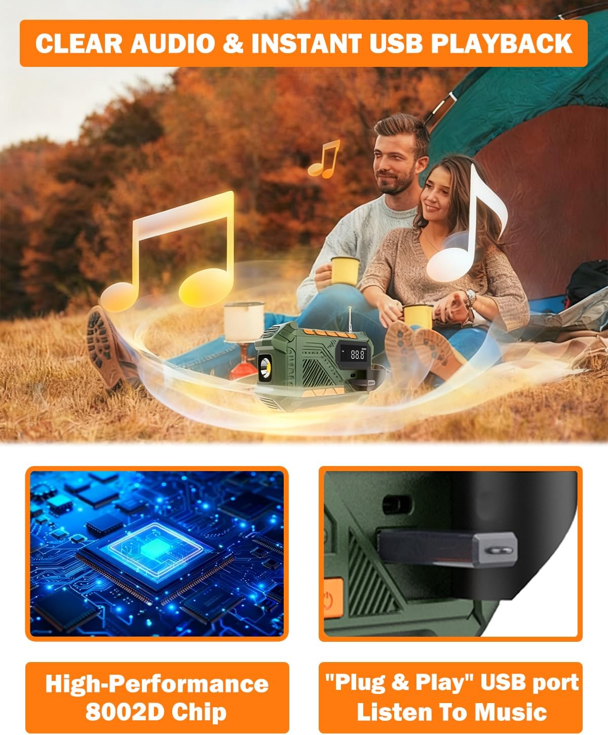 【More Than Just a Radio】—Featuring the 8002D amplifier chip for rich, clear sound quality. Effortlessly tune into your favourite radio programmes, supporting AM (520–1710 KHz), FM (87–108 MHz) and WB (162.400 – 162.550MHz) bands. Simply plug in a USB drive to enjoy your favourite music, podcasts or audiobooks anytime, anywhere—no internet connection required. Perfect entertainment, wherever you are!