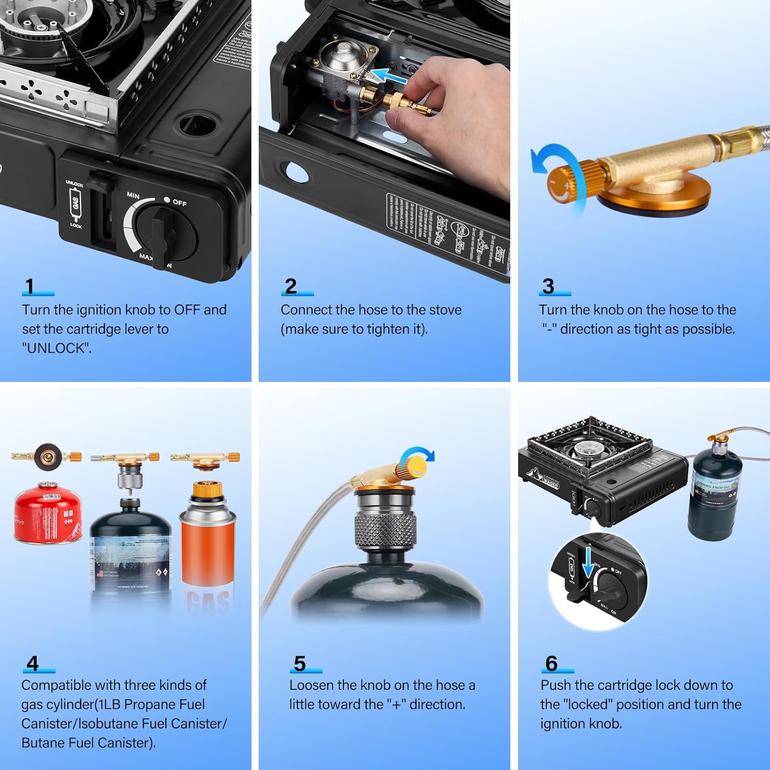 Attention Note: Propane butane isobutane canisters cannot be directly installed in the stove’s cartridge because the stove and hoses design can keep the cylinders away from the stove, avoiding the risk of high cylinder temperature. In addition, it is necessary to correctly connect the gas cylinder, adapter, and pipe, tighten each interface to avoid malfunction.