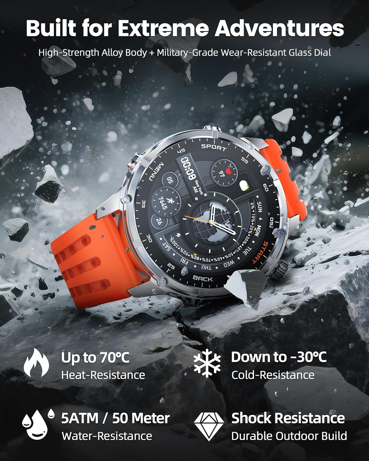 Yes. It’s 5ATM waterproof (up to 50m) and built with zinc alloy and 8H AMOLED glass. Works perfectly in freezing temps or underwater—tested to handle extreme outdoor conditions.