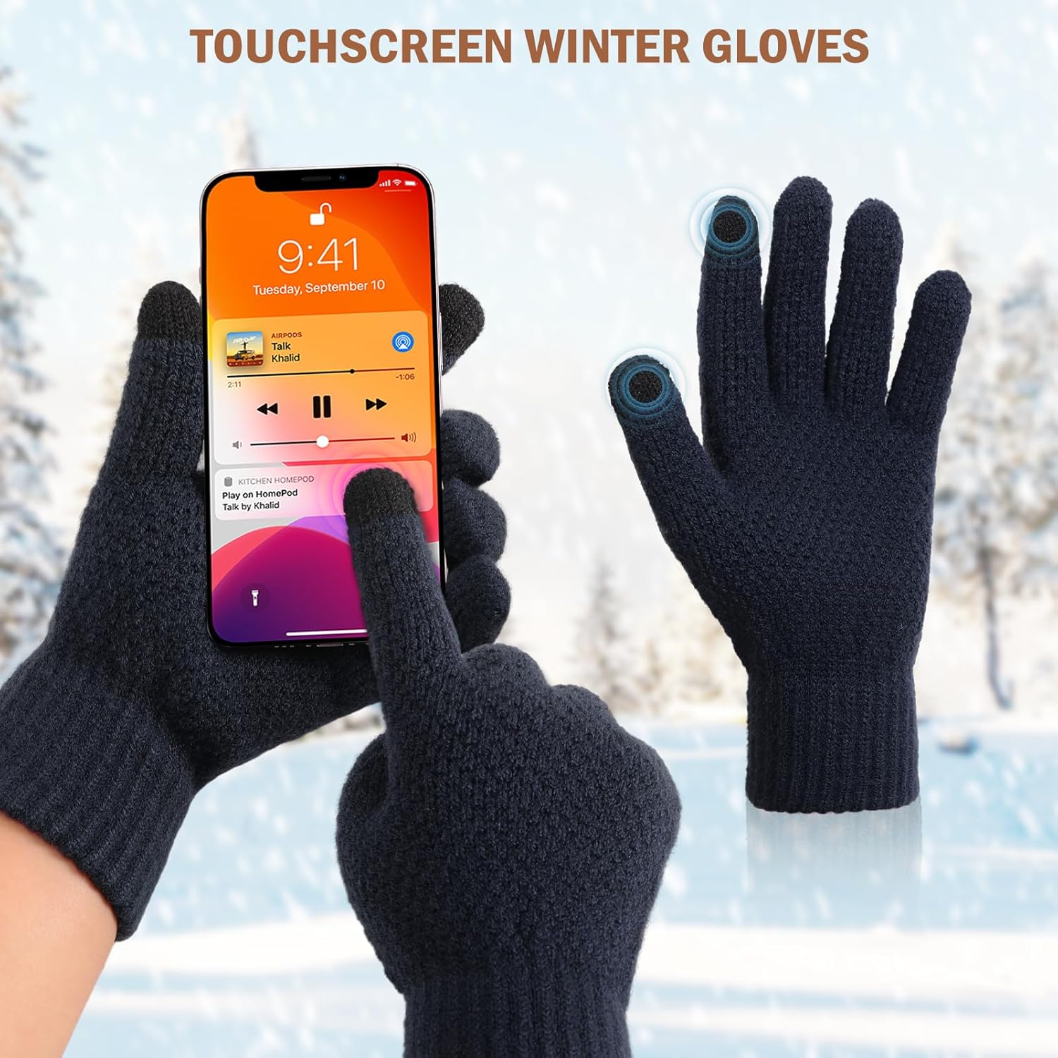 Skin-friendly, breathable, soft, cozy. Four colors and two patterns are available. Both scarf and gloves made with 100% soft polyester. Thumb, index fingers touchscreen compatibility. Practical and stylish for the fashion look to match with any outfit, or for winter activities like skiing, snowboarding.