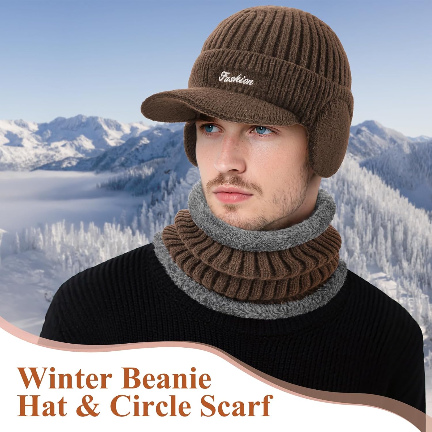 Winter Hat with Ear Flaps for Men, Beanie with Brim Hat Scarf Set, Warm Fleece Lined Skull Cap Neck Warmer for Women