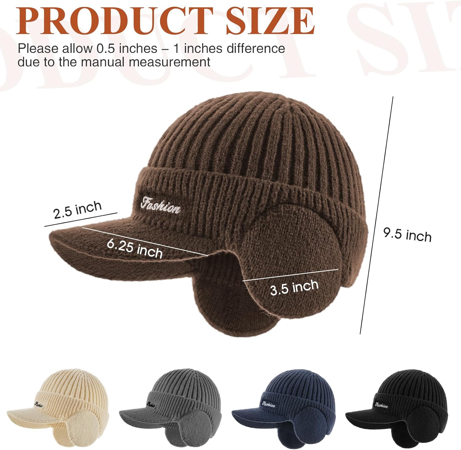Knitted hat scarf set is elastic that can fit most men and womenHat with ear flaps fit for head circumference: 22″-25″Hat brim: 6.25″. The neck warmer: 8″ * 8.75″ (H*W)