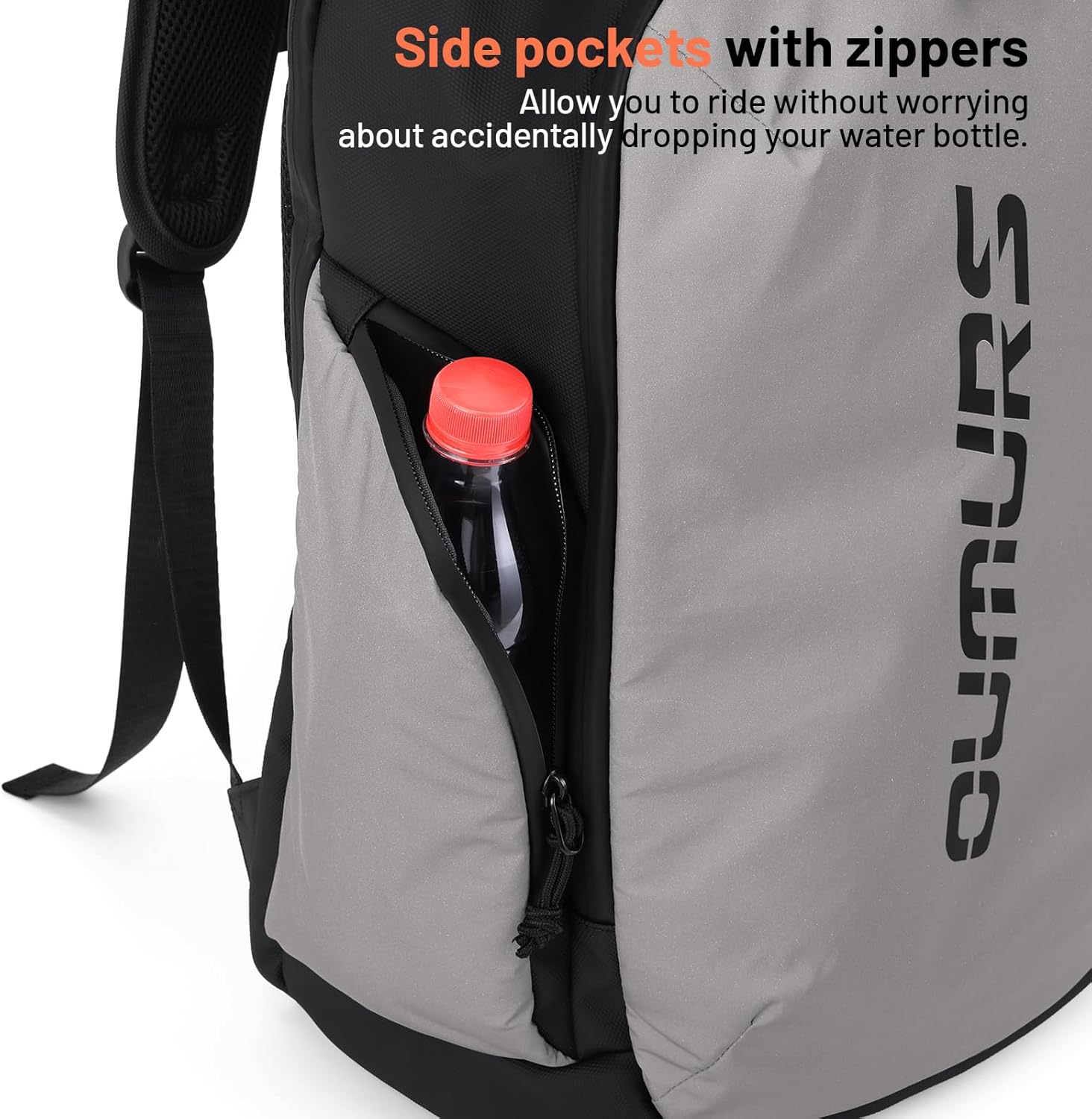 OUMURS backpack made of large pieces of reflective material, which can effectively alert following vehicles when cycling at night, making it both stylish and safe.