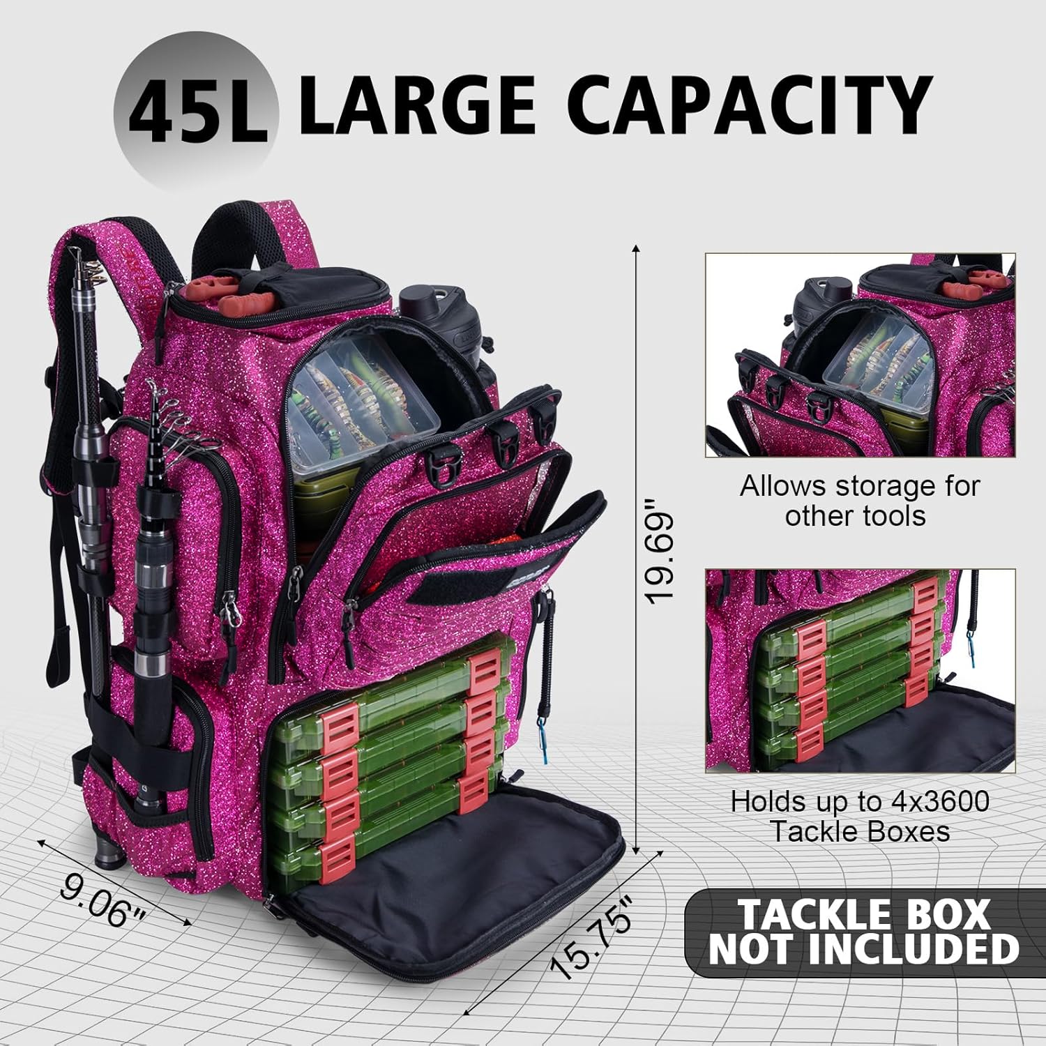 Multi-Functional Storage Pockets: This fishing bag has a 45L large capacity storage compartment. The tackle backpack also features a sunglasses pocket, a water bottle pocket, 2 fishing rod fixing straps, 2 pliers pockets, a mesh pocket, and 8 zipper pockets for organized storage. The tactical Molle system and multiple D-rings offer endless options for hanging extra accessories. The front mesh pocket with reflective safety strips ensures visibility during low-light night fishing sessions