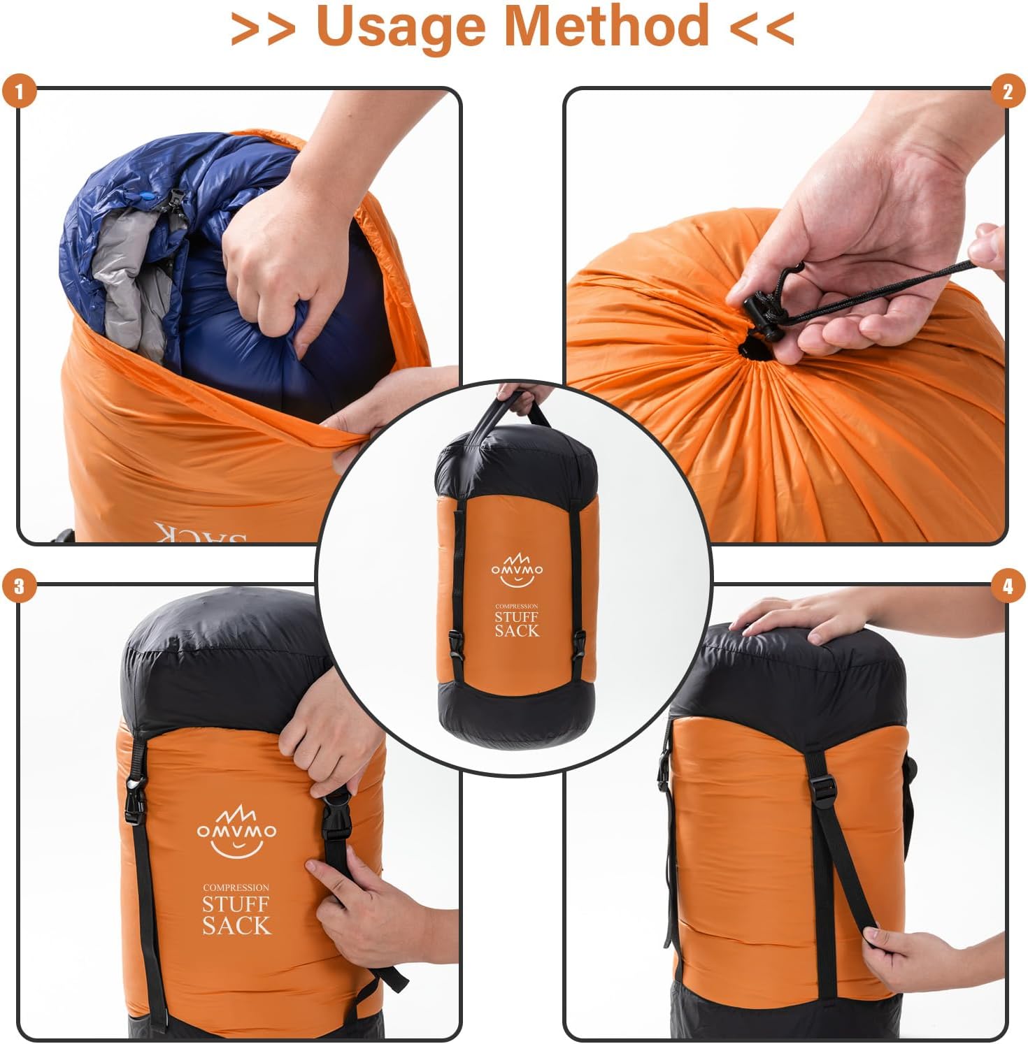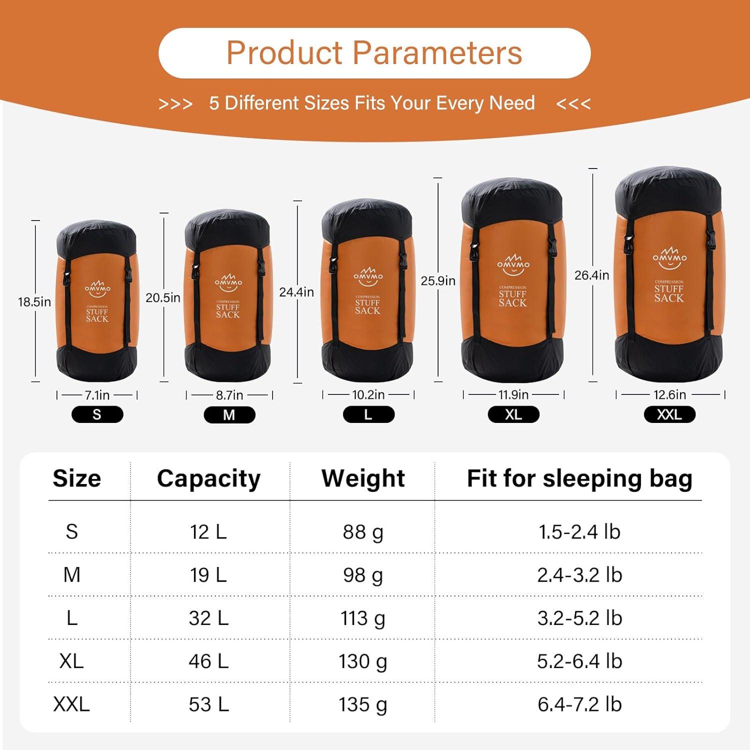 ✅Ultra-light and Durable: The top and bottom sections of these compression bags are constructed with 320T 40D nylon, while the body is made of 400T 20D nylon, the same material used in high-quality down sleeping bags. Both types of nylon are water-resistant and highly tear-resistant. The weights of each bag size are as follows: 0.2lbs (S/12L), 0.22lbs (M/19L), 0.25lbs (L/32L), 0.29lbs (XL/46L), 0.3lbs (XXL/53L). These lightweight bags won’t add any burden to your journey.