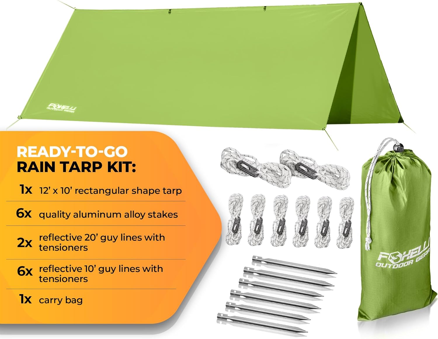 ULTRALIGHT & PORTABLE: Foxelli camping rain tarp weighs only 2.4 LB in its full kit with ropes and stakes included. Carrying it is a breeze! The tent kit fits compactly in a small carrying bag, making it convenient to travel with and store at home when not in use. Because of its portability, hammock tarp is advantageous for backpackers & hikers. Always carry your tent hammock rain fly and be the hero who offers your buddies shelter from the rain!
