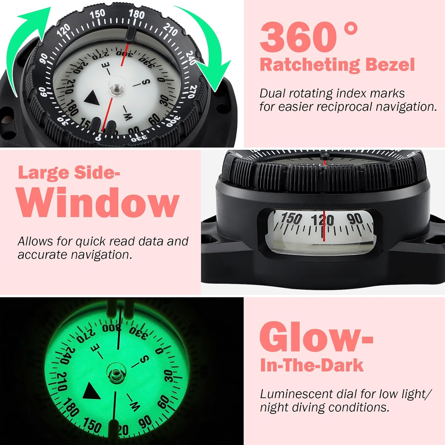 EASY-TO-READ – The diving compass font scale is clear and easy to read. with the larger transparent window is easy to aim, and a luminous display for easy reading in low light conditions. A side window readout with magnification allows reading from the side for easy underwater navigation.