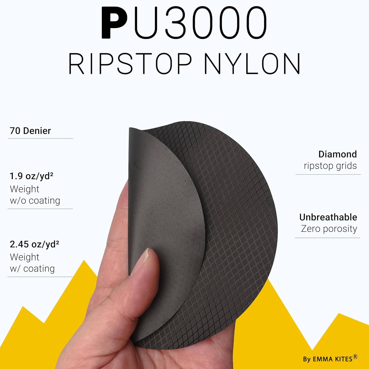 Ripstop Nylon PU3000 by EMMA KITES is 100% waterproof, light, and durable, and offers excellent abrasion and tear resistance. This fabric is ideal for making outdoor gears that provide protection from water penetrating in most conditions, such as tent rainfly, tarp, poncho, rain skirt, pack cover, backpack, shelter, and more.