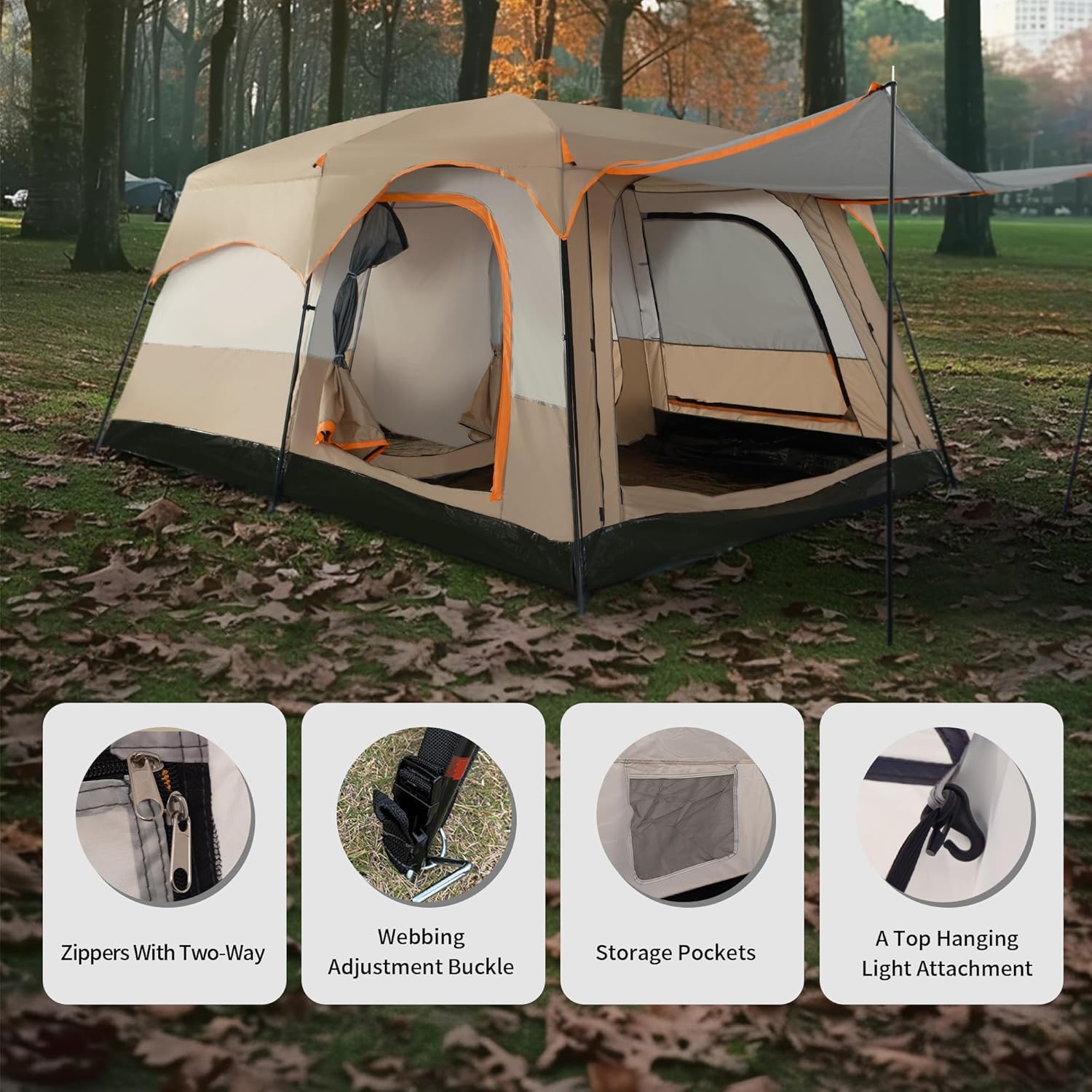 【large space & ventilation】 interior accommodates 8-10 people,Tent size:169.29×120.08×78.74inches, Standing and stretching inside easy.Extended size of Canopy:82.68×70.87inches increasing space.it has curtain that can divided to 2rooms,increase privacy.It also has 3 mesh doors 3 mesh windows,the skylight is use full mesh,that for good ventilation and against mosquito